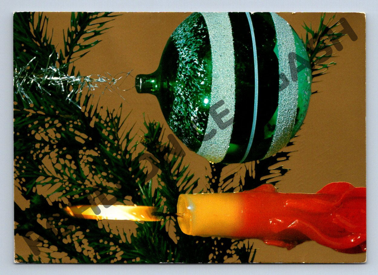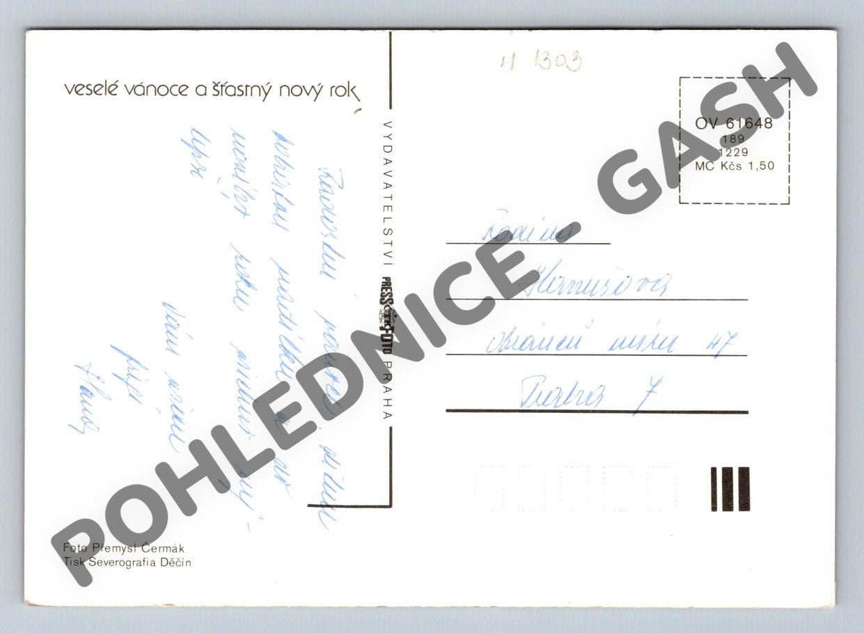 Vánoční pohlednice z období Československa, s fotografií vánoční ozdoby a svíčky na jedlové větvi, barevná. Pohlednice je použitá, s ručně psaným textem a adresou. Na přední straně je typický novoroční motiv ze 70. nebo 80. let 20. století. Na zadní straně přání Veselé Vánoce a šťastný nový rok. Foto Přemysl Čermák, tisk Severografia Děčín. Stav velmi dobrý, rohy lehce otřelé od ukládání.