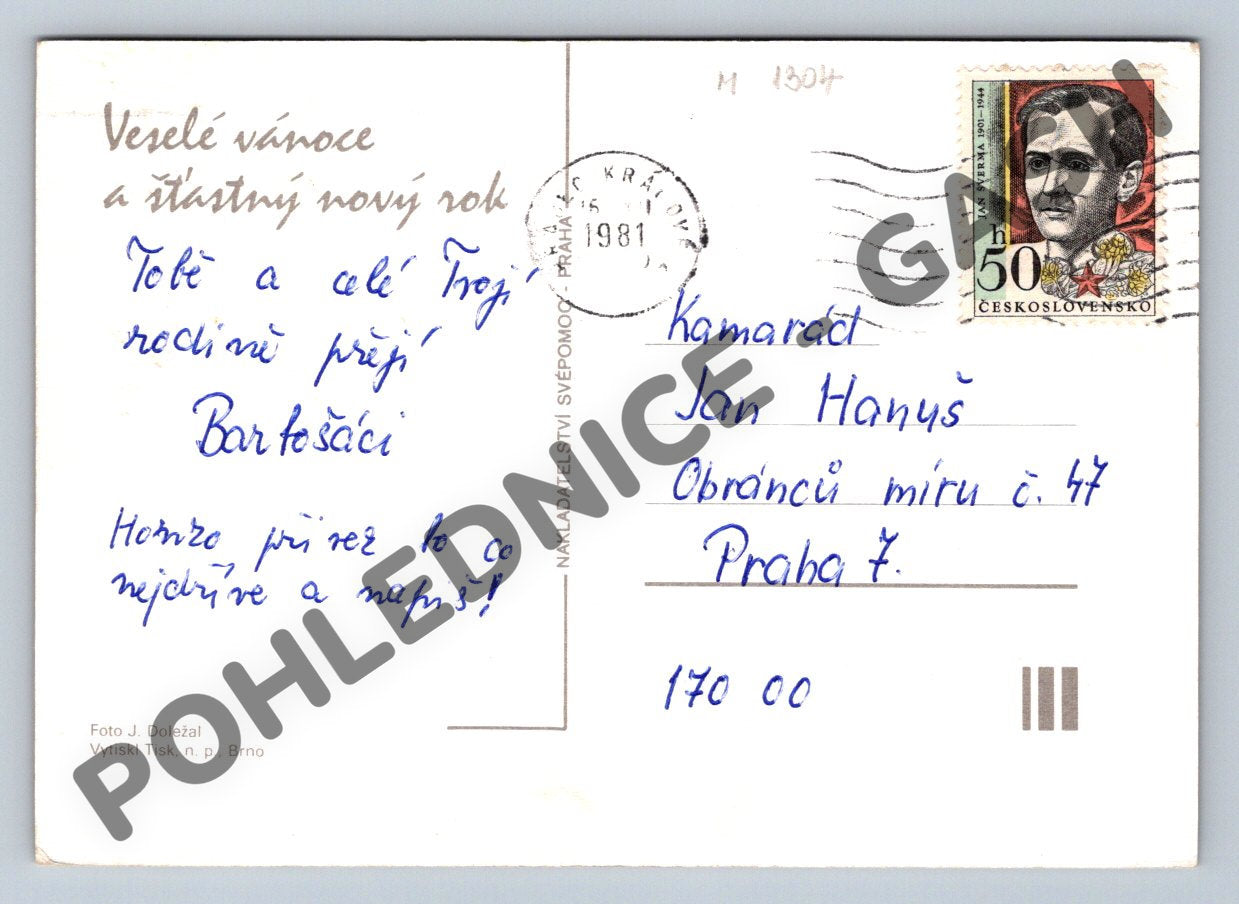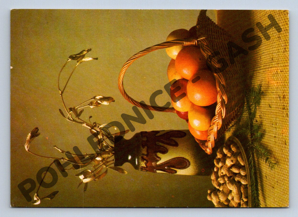 Originální pohlednice s motivem zátiší – košík s ovocem, mísou arašídů a vázičkou se suchými větvičkami. Pohlednice byla odeslána v roce 1981 z Československa, což dokládá razítko i původní známka s portrétem. Na zadní straně je ručně psané vánoční a novoroční přání a adresa v Praze. Jedná se o autentický sběratelský kousek s reálnými známkami užívání, vhodný pro sběratele starých pohlednic a milovníky retro vánočních motivů.
