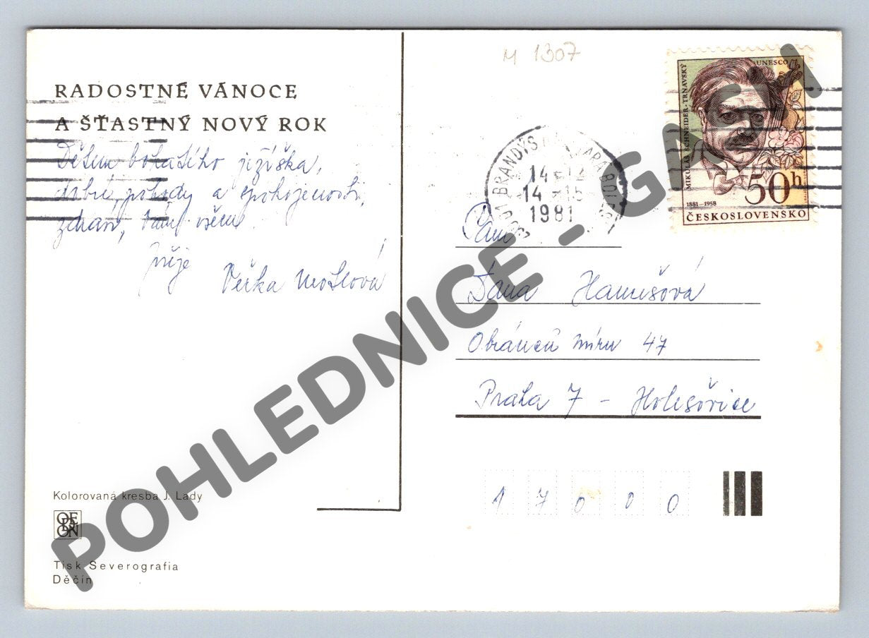 Vánoční pohlednice s barevnou ilustrací od Josefa Lady. Na obrázku je zimní krajina s postavou nesoucí domů vánoční stromek, v pozadí se nachází vesnice a kostel, zasněžené stromy a domy, typický rukopis J. Lady. Zadní strana obsahuje ručně psané věnování s přáním Radostné Vánoce a šťastný Nový rok, pohlednice byla odeslána v roce 1981 a je opatřena československou známkou s portrétem Bedřicha Smetany v hodnotě 50 haléřů. Pohlednice je kolorizovaná, tisk Severografia Děčín. Zachovalý stav, vhodná pro sběratele ladovských motivů a milovníky české klasiky.