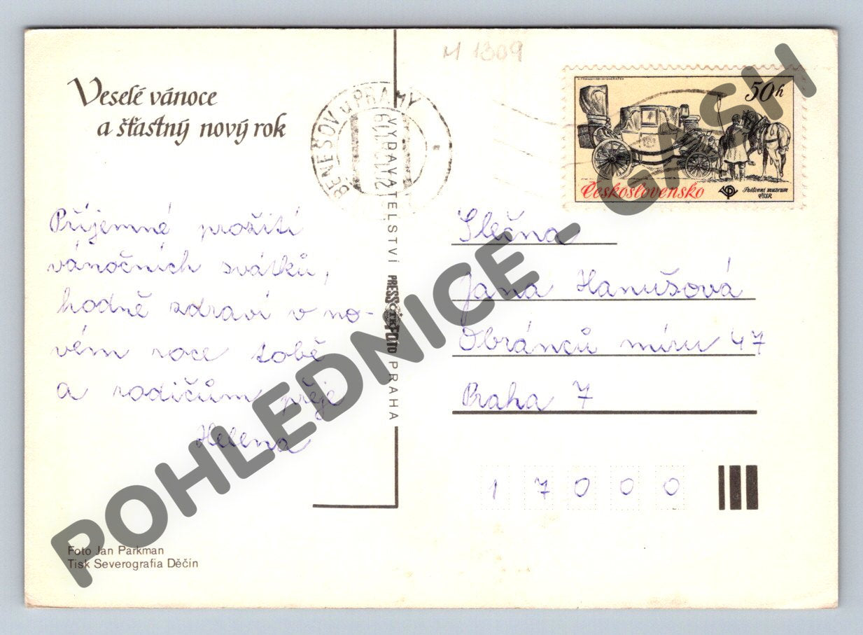 Originální československá pohlednice s vánoční tematikou. Na přední straně je vyobrazena stylizovaná vánoční kompozice s ovocem (jablka), ořechy, větvičkami jehličnanu a slaměnými ozdobami v proutěném košíku. Zadní strana je ručně popsaná s přáním Veselé Vánoce a šťastný nový rok a adresovaná slečně do Prahy. Pohlednice má známku s motivem kočáru a je razítkovaná. Vydáno v Československu, tisk Severografia Děčín, foto Jan Parkman. Velmi pěkný sběratelský stav, vhodné také jako retro dárek nebo dekorace.