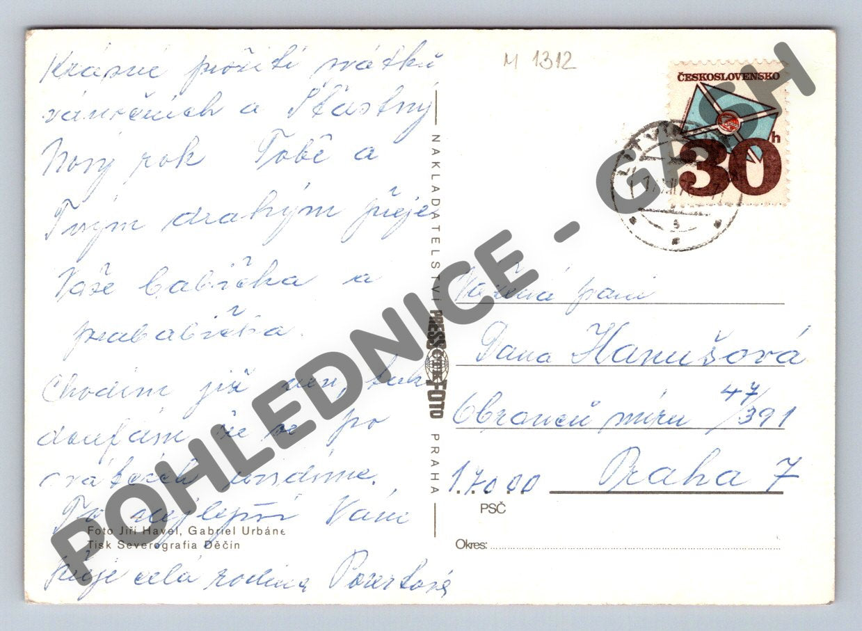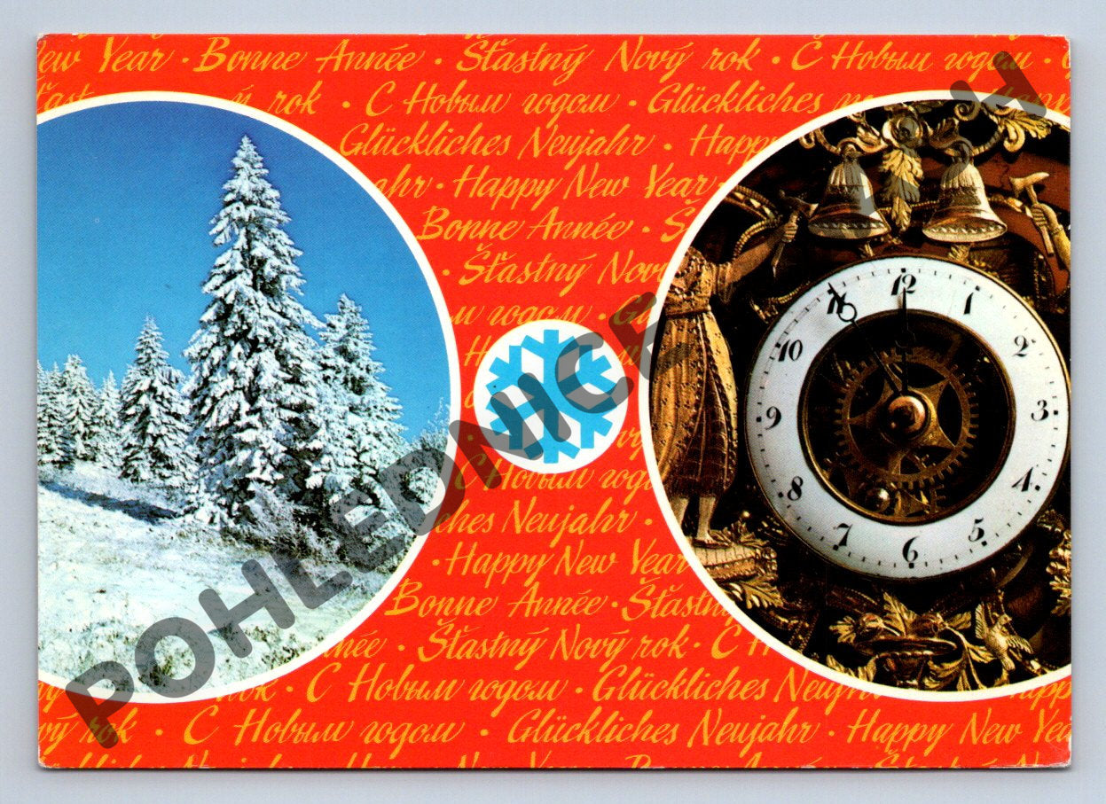 Starší novoroční pohlednice z Československa s motivem zimní krajiny se zasněženými stromy a hodinami symbolizujícími příchod nového roku. Pohlednice je tištěna ve více jazycích s přáním šťastného a nového roku. Na zadní straně je použita poštovní známka ČSSR v hodnotě 30 h a osobní vzkaz adresovaný paní do Prahy. Pohlednice nese známky oběhu, vhodná pro sběratele historických novoročních pohlednic i milovníky českých tradic.