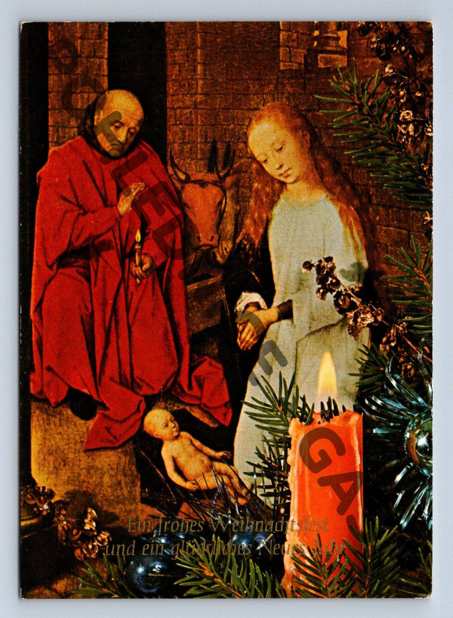 Vánoční pohlednice s reprodukcí slavného malířského díla, zobrazujícího betlémskou scenérii narození Ježíše Krista. Na přední straně pohlednice je vyobrazena svatá rodina u jesliček, v pozadí je oslík, na větvích jehličnanu svítí velká červená svíce. Pohlednice obsahuje ručně psaný vzkaz, zadní strana je ve stylu klasické korespondence s prostorem pro známku. Vytištěno v Německu. Pohlednice je vhodná pro sběratele tématických a náboženských pohlednic, případně milovníky historického malířství.