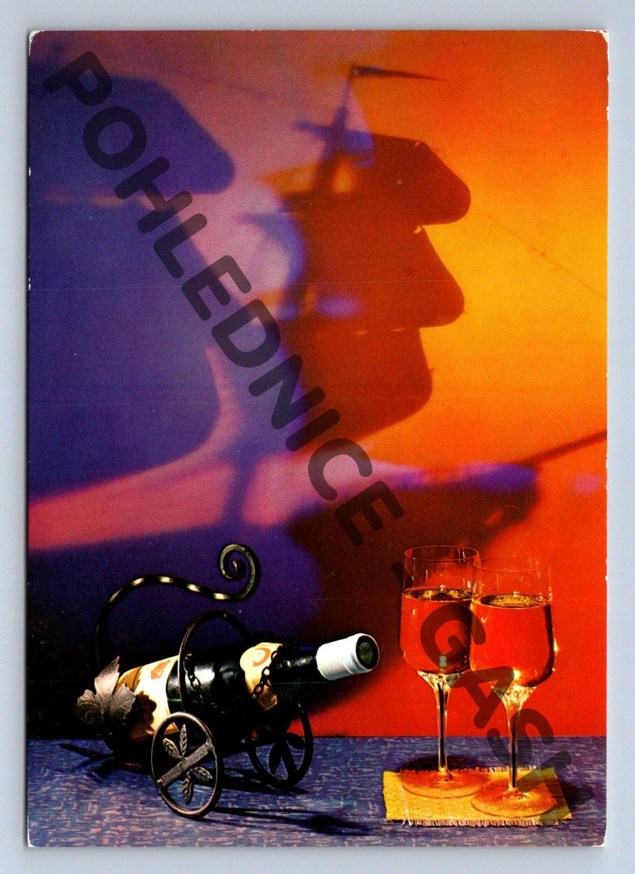 Vánoční a novoroční pohlednice – skleničky a lahev, ČR, Orbis