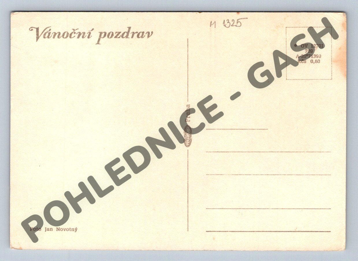 Starší vánoční pohlednice s motivem červené svíčky, smrkových větví, šišek a přírodních dekorací. Na přední straně je stylizované aranžmá ve vánočním duchu s hořící svíčkou, vhodné jako tradiční český vánoční pozdrav. Na zadní straně nápis Vánoční pozdrav , místo pro známku, adresu a vzkaz. Fotografie: Jan Novotný. Pohlednice nebyla použita a je ve velmi dobrém stavu. Ideální pro sběratele historických pohlednic nebo jako retro dekorace.