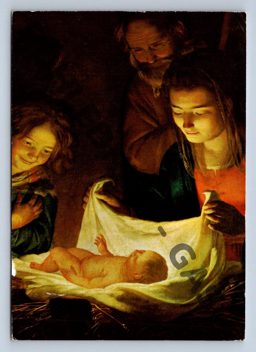 Vánoční pohlednice s reprodukcí klasicistního malířského díla zobrazujícího scénu Narození Ježíše, s výraznými postavami Panny Marie, svatého Josefa a malého Ježíška v jeslích. Pohlednice byla zaslána v roce 1989 z Rakouska (viz známka s motivem Vánoc Weihnachten 1989) adresovaná do České republiky. Na zadní straně je ručně psaný vzkaz v němčině. Celkově je pohlednice v dobrém sběratelském stavu, lehké známky opotřebení na hranách. Ideální přírůstek do sbírky pohlednic s vánoční či náboženskou tematikou nebo tematického malířství.