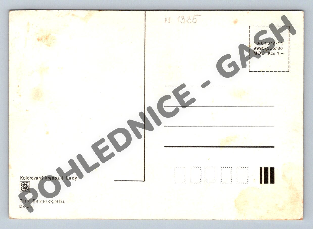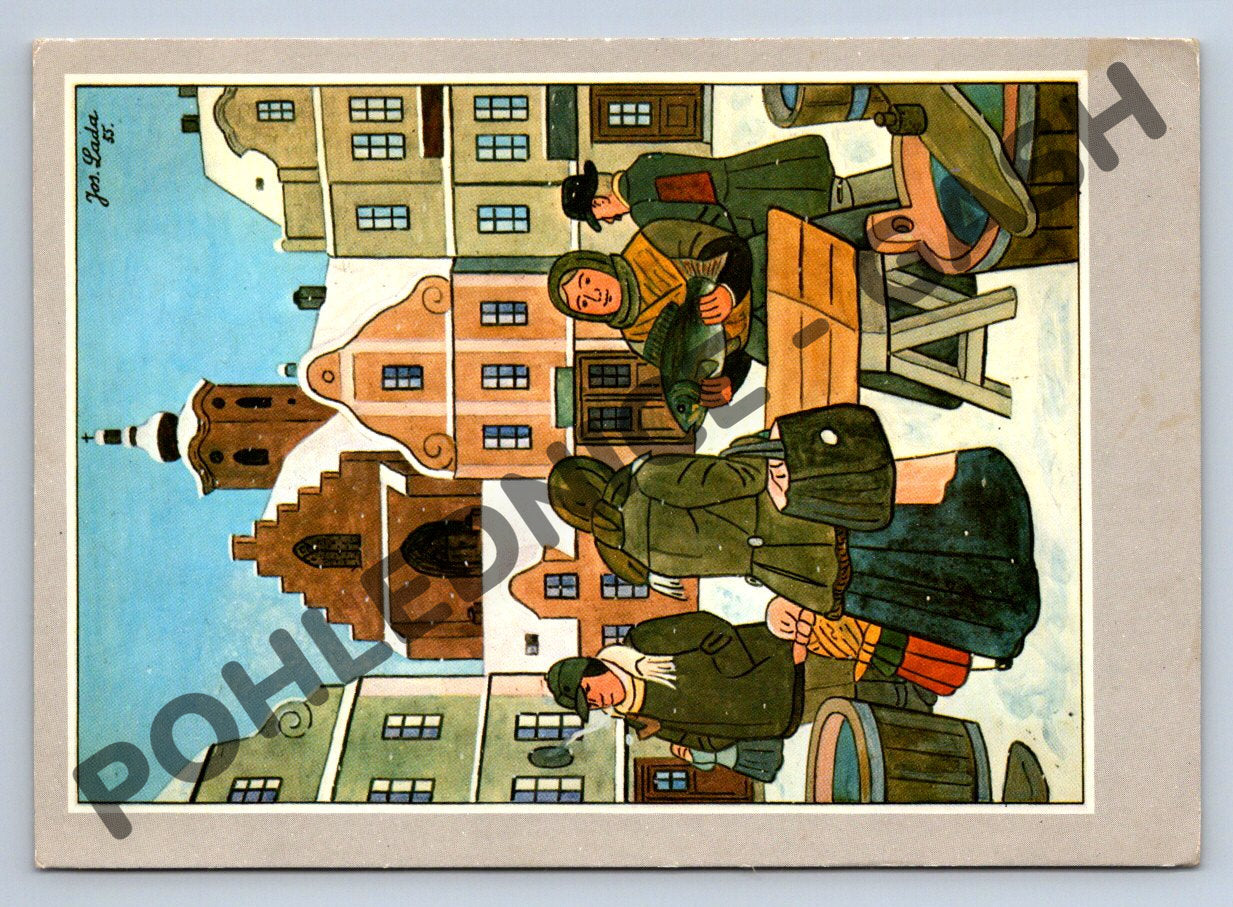 Originální česká pohlednice s kolorovanou kresbou od Josefa Lady. Na kresbě je vyobrazena typická zimní tržnice na malém městském náměstí s postavami v krojích, prodávající ryby. Pohlednice pochází z období socialistického Československa, tisk Severografia Děčín. Rozměry klasického malého formátu, pohlednice je čistá, nepopsaná, ve velmi dobrém stavu s drobnými známkami stáří (viz foto). Skvělý sběratelský kousek pro milovníky českého malířství a tvorby Josefa Lady.
