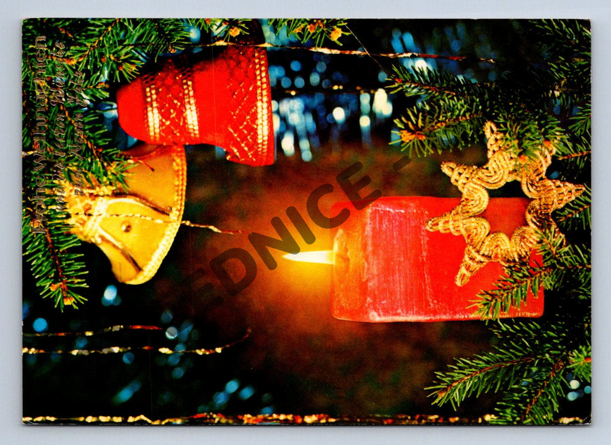 Nabízím originální pohlednici s vánoční tematikou ze západního Německa, zaslanou v roce 1975 do Československa. Pohlednice zobrazuje krásnou vánoční výzdobu – svíčka, ozdoby a větvičky jehličnanu na barevném snímku. Zadní strana je orazítkovaná a opatřená známkou Deutsche Bundespost v hodnotě 60 Pfennig, s razítkem Engelsberg. Pohlednice obsahuje osobní ručně psaný vzkaz v němčině a byla adresovaná do Žatce. Stav velmi dobrý, pouze drobné stopy po oběhu odpovídající stáří. Vhodné pro sběratele pohlednic, milovníky vánoc, historických dokumentů či zájemce o poštovní historii mezi Německem a ČSSR. Rozměr klasického formátu.