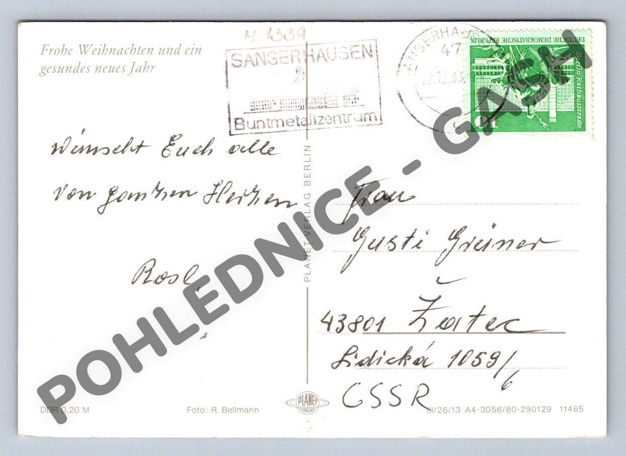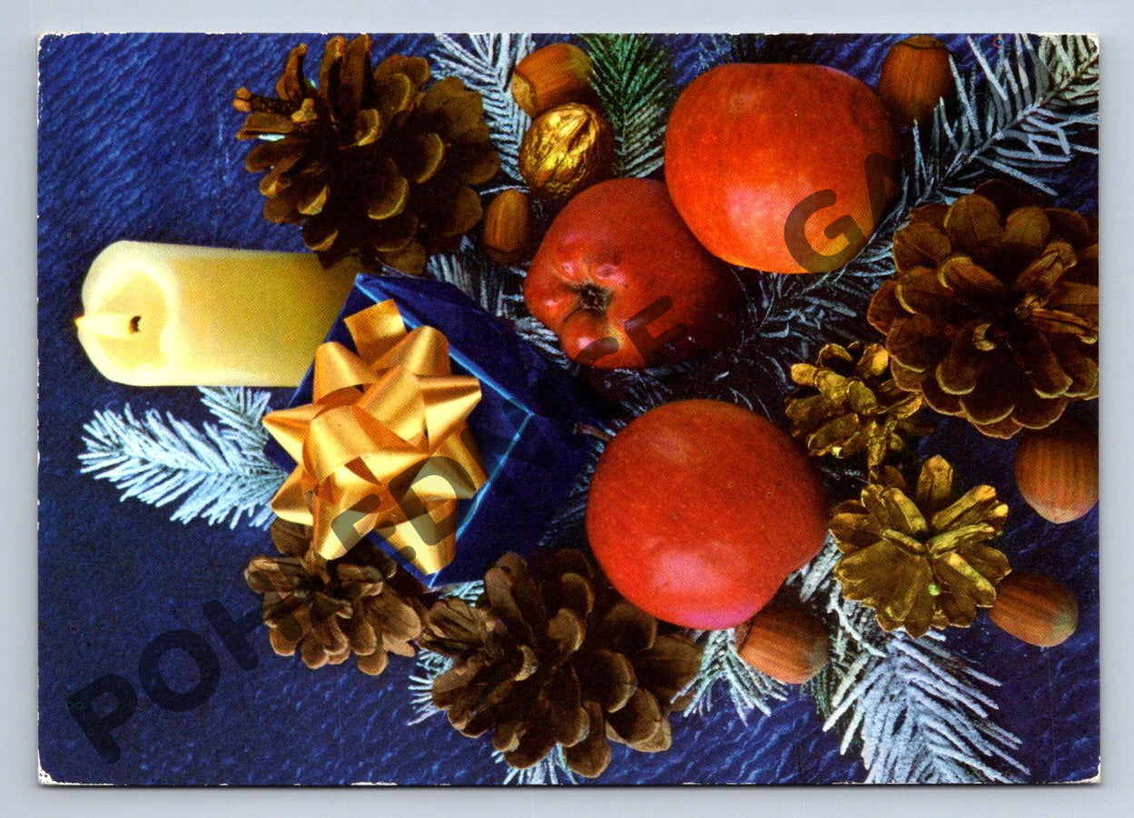Tato pohlednice z období Německé demokratické republiky (DDR) byla odeslaná v roce 1989 do Československa. Na přední straně je krásná vánoční aranž s jablky, svíčkou, ozdobami, borovými šiškami, oříšky a větvičkami, typická pro evropské Vánoce 80. let. Zadní strana obsahuje ručně psané věnování, německé poštovní razítko a známku DDR. Jedná se o zajímavý sběratelský kus s vánoční tematikou v původním, velmi dobrém stavu. Ideální pro sběratele starých pohlednic, milovníky retro nebo vánočních motivů.