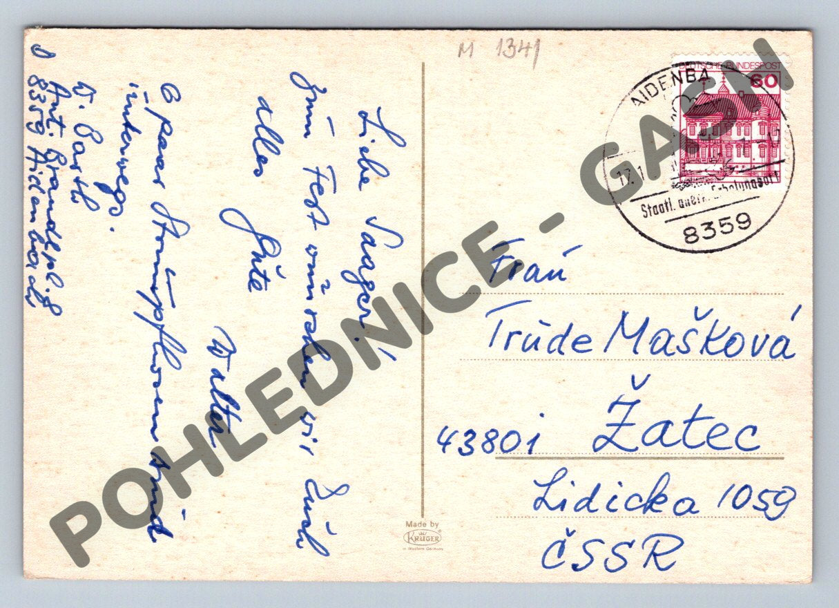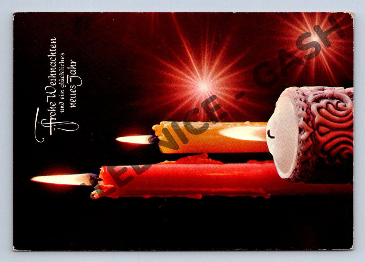 Vánoční pohlednice z Německa s motivem hořících svíček, přání Frohe Weihnachten und ein glückliches neues Jahr na přední straně. Jedná se o použitou pohlednici s německou známkou, ručně psaným textem a poštovním razítkem Aidenbach. Pohlednice je adresovaná do Československa a má zachovalý stav, pouze drobné známky použití na rozích. Ideální sběratelský kus zachycující atmosféru Vánoc v Německu v minulém století.