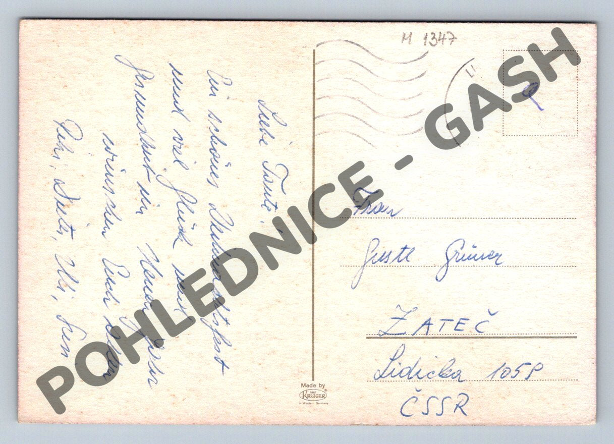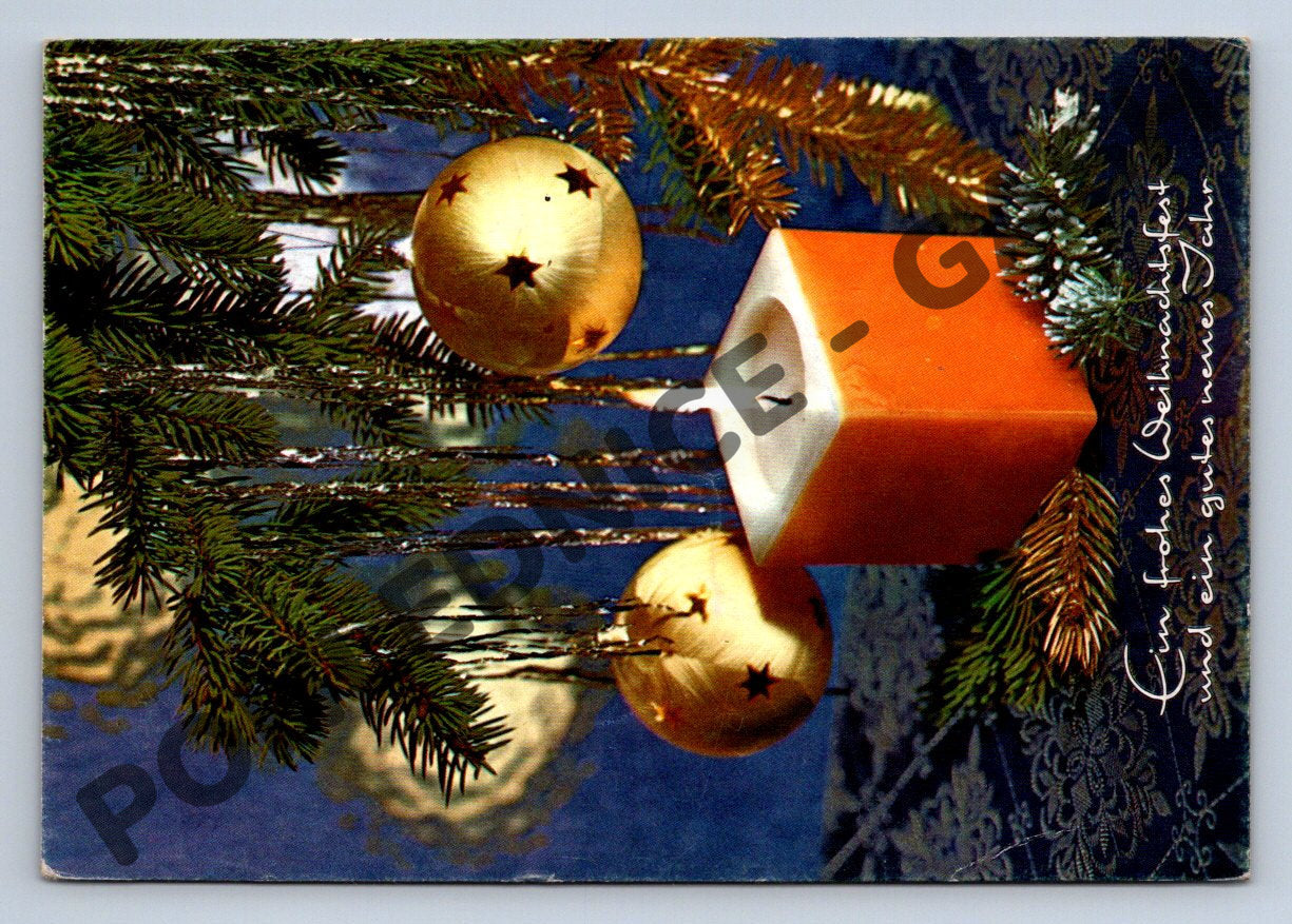 Vánoční pohlednice z Německa, přední stranu zdobí svíčka a vánoční ozdoby na větvičce jehličnanu, v pozadí modré vánoční dekorace. Na pravé straně je natištěné německé přání k Vánocům (Ein frohes Weihnachtsfest und ein gutes neues Jahr). Zadní strana je popsána ručně německým textem a adresována do Žatce v bývalém Československu (ČSSR). Pohlednice pochází od vydavatelství Krüger, vyrobená v Západním Německu. Jedná se o typickou sběratelskou novoroční pohlednici z období druhé poloviny 20. století. Dobrý sběratelský stav, bez známky, poštovně prošlá.