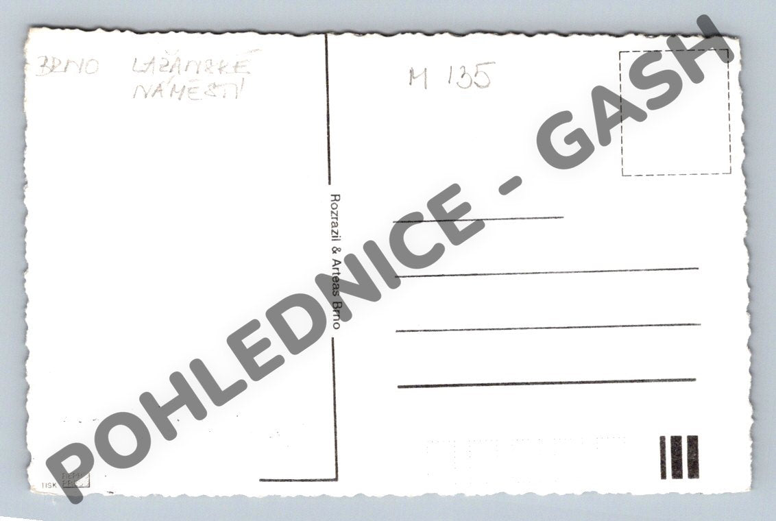 Starobylá pohlednice zobrazující Lažanské náměstí v Brně, známé též jako Brünn, s krásným historickým pohledem na náměstí a přilehlé budovy. Pohlednice je v černobílém provedení, s výraznými detaily architektury na náměstí a sochou v popředí. Na zadní straně jsou vyznačeny linky pro adresu a známku, vydavatel Rozrazil & Arteas Brno. Vhodné pro sběratele historických pohlednic i milovníky architektury a historie Brna. Výborný stav, nenačatá, bez známky a popsané adresní strany.