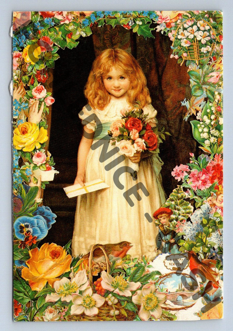 Pohlednice dívka s kyticí květinový rámeček německý text (M1360)