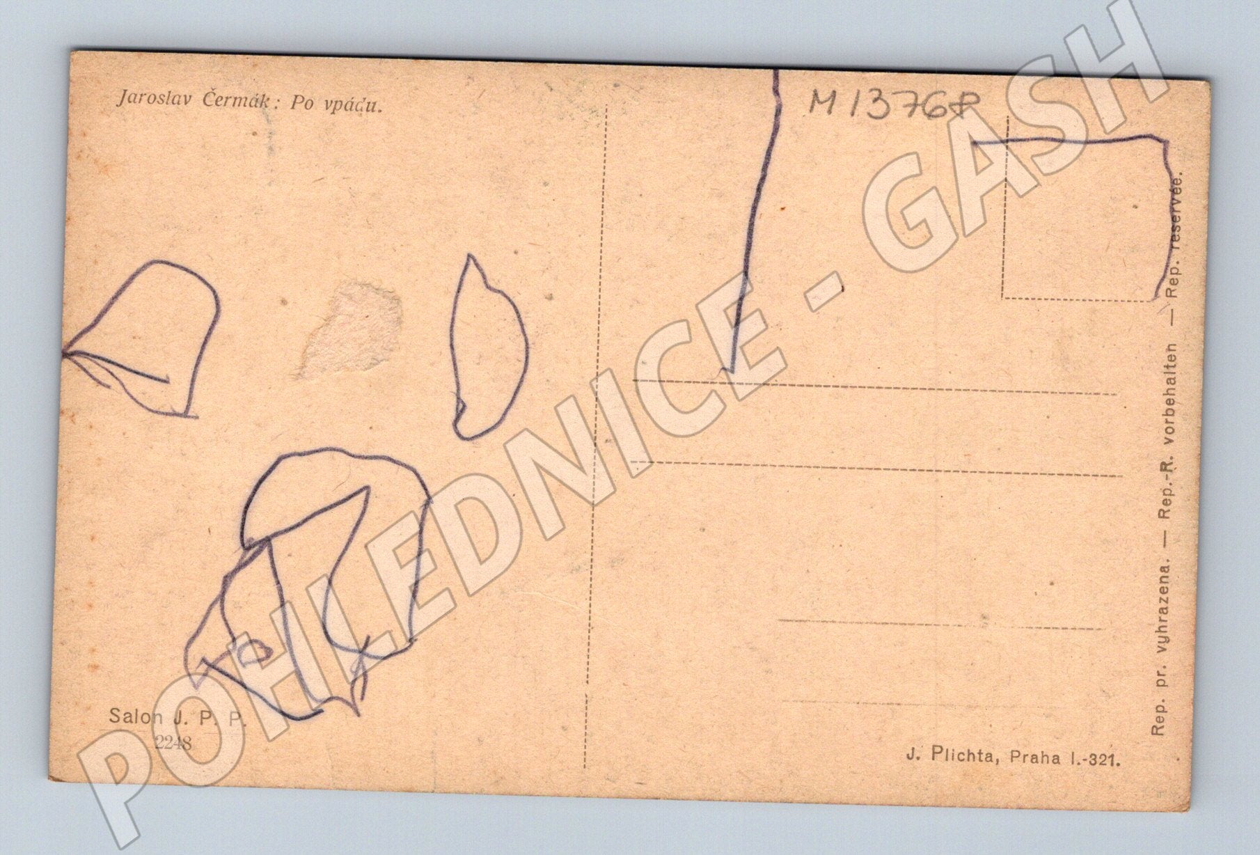 Originální pohlednice s reprodukcí obrazu Jaroslava Čermáka s názvem Po vpádu . Na přední straně je romantická historická scéna zachycující zraněného muže v náručí ženy, detailně provedená v dramatickém prostředí s dělem a ruinami. Zadní strana je neprošlá, obsahuje ručně načrtnuté kresby perem a vytištěné informace o autorovi, názvu díla a vydavateli (Salon J. P. P., J. Plichta, Praha). Pohlednice je vhodná pro sběratele umění, milovníky historických motivů i zájemce o staré pohledy. Mírné známky stáří a lehké poškození rohů, stav odpovídá fotografii.
