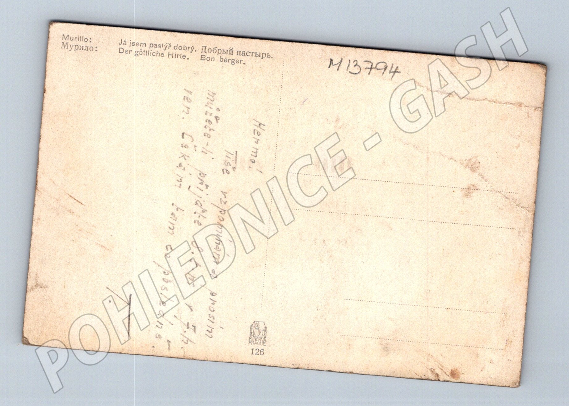 Starší pohlednice s reprodukcí slavného obrazu Dobrý pastýř od španělského barokního malíře Bartolomé Estebana Murilla. Na pohlednici je vyobrazen malý pastýř s beránkem v pastoralní krajině, inspirovaný biblickým motivem. Zadní strana pohlednice obsahuje nápis v několika jazycích, včetně češtiny: Já jsem pastýř dobrý . Pohlednice nese stopy stáří, drobné ohyby v rozích a menší zašpinění, jak je patrné na fotografiích. Vhodné pro sběratele historických a uměleckých pohlednic nebo milovníky starých reprodukcí malířských děl.