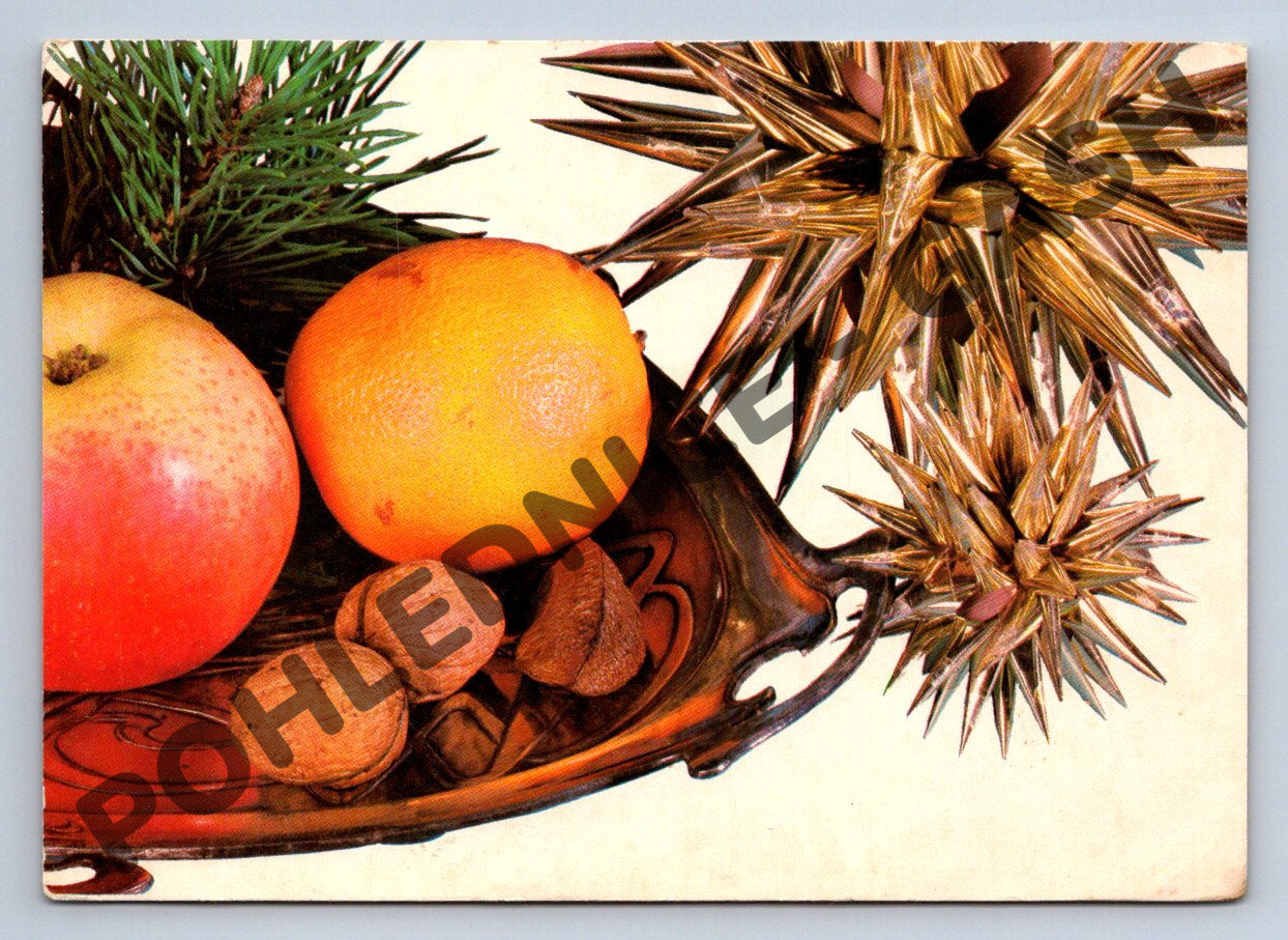 Vánoční pohlednice z Československa s originálními dekoracemi typickými pro tradiční vánoční stůl: na přední straně je mísa s ovocem (jablko, pomeranč) a vlašskými ořechy, doplněná o třpytivé vánoční ozdoby a zelené větvičky jehličnanu. Rubová strana obsahuje ručně psané osobní přání s datem a adresou, pohlednice je ofrankovaná československou poštovní známkou v hodnotě 30 haléřů. Jedná se o sběratelsky zajímavý kousek, který krásně představuje atmosféru Vánoc v tehdejším Československu. Autor fotografie: Petr Kopečný, tisk Severografia Děčín. Dobrý sběratelský stav, pouze drobné známky stáří.