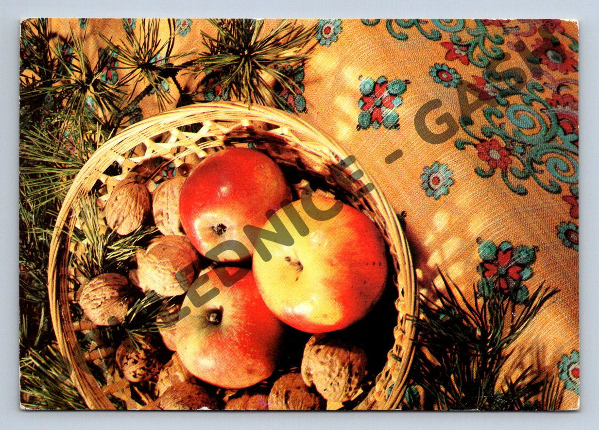 Vánoční pohlednice s tradičním motivem: na přední straně je košík se jablky a vlašskými ořechy položený na vyšívaném ubrusu a doplněný větvičkami jehličí, což navozuje sváteční a domácí atmosféru Vánoc. Z rubové strany je pohlednice vyplněná, zaslaná v roce 1981 s přáním krásných Vánoc. Na pohlednici je dobová známka Československo. Autorem fotografie je J. Nechvíl, vydavatel OTK Hradíštko, Panorama Praha. Ideální k rozšíření sbírky vánočních tematických pohlednic nebo nostalgický dárek.