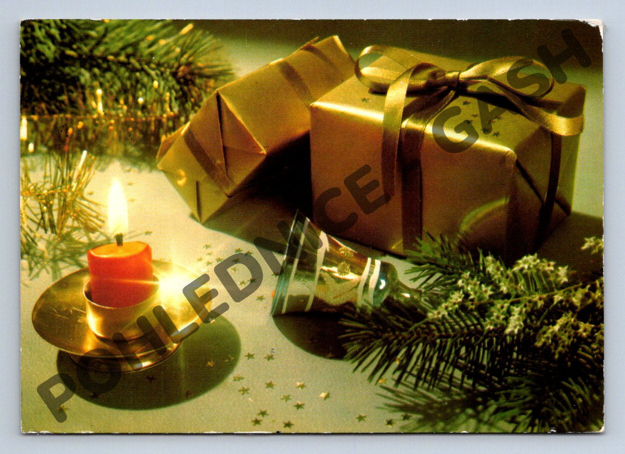 Vánoční pohlednice z bývalého Československa, zaslaná v roce 1988. Na líci je vyobrazen slavnostně zabalený zlatý dárek, rozsvícená svíčka, smrková větvička a vánoční ozdoba. Zadní strana obsahuje přání Veselé vánoce a šťastný Nový rok 1988 a adresátku do Prahy s dobovou poštovní známkou SSSR. Pohlednice je tištěna a fotografována Pavlem Čandou, tisk Severografia Děčín. Skvělý sběratelský kousek s retro atmosférou 80. let vhodný do sbírky pohlednic s vánoční tematikou nebo na připomenutí starších tradic.