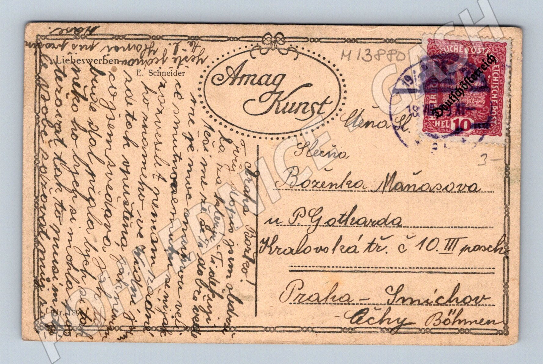 Starobylá německá pohlednice s krásnou malířskou reprodukcí – romantická scéna dvoření v přírodě. Pohlednice je ručně popsaná, odeslaná, frankovaná známkou Rakousko-Uherska, s jasně čitelným adresátem v Praze-Smíchov. Viditelné jsou detaily typické pro umělecké pohlednice počátku 20. století (lidové kroje, atmosféra). Pohlednice je v zachovalém stavu, vhodná do sbírky historických malířských pohlednic nebo pro milovníky starých korespondencí.