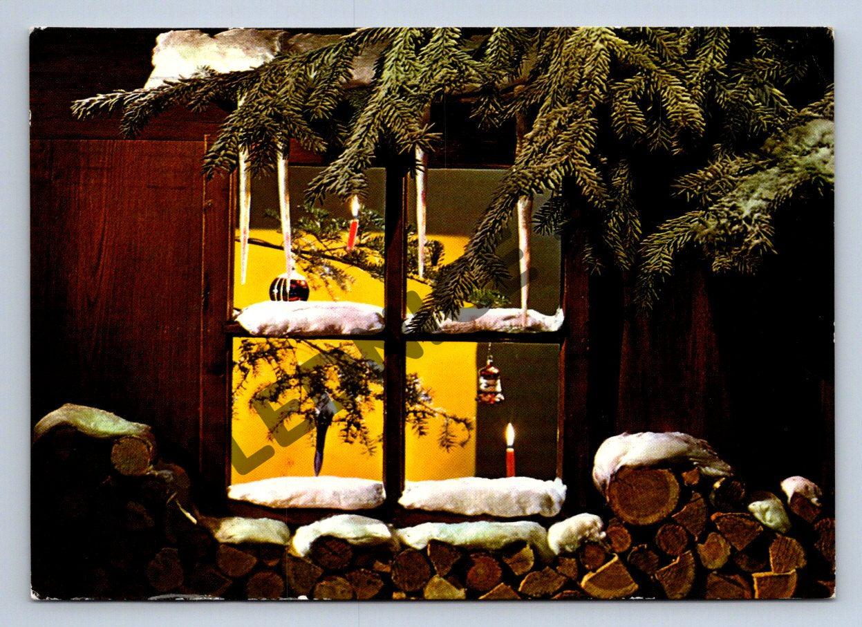 Vánoční pohlednice z dob Československa. Pohlednice zobrazuje zimní venkovskou scenérii s oknem dekorovaným jehličnatými větvemi a zasněženými poleny dřeva, vnitřek je vyzdoben vánočními ozdobami a svíčkami. Na zadní straně je ručně psané věnování z roku 1971, pohlednice byla odeslána s poštovní známkou prezidenta Ludvíka Svobody a poštovním razítkem z Prahy. Československá pohlednice, tisk Severografia Děčín, foto Vladimír Stehlicht. Krásný kousek do sbírky historických pohlednic či milý vánoční dárek.