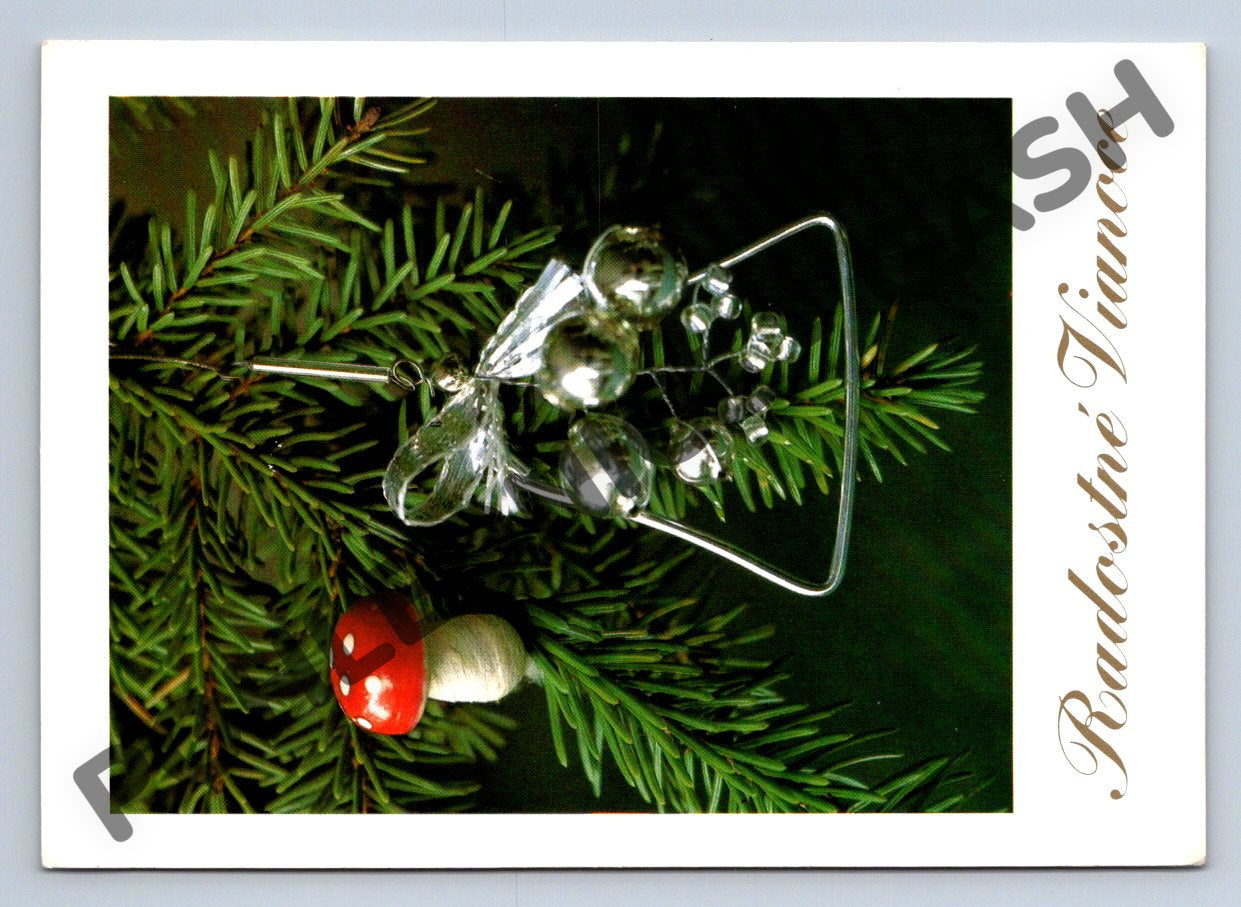 Vánoční pohlednice ze starého Československa, odeslaná v roce 1989, s tradičním motivem vánoční ozdoby ve tvaru andílka na smrkové větvi a houbou muchomůrkou. Na přední straně je nápis Radostné Vánoce . Pohlednice je opatřena dobovou známkou (Československo 50 haléřů) a ručně psaným přáním. Krásný sběratelský kousek s autentickou atmosférou Vánoc z přelomu 80. a 90. let 20. století. Stav pohlednice je velmi dobrý, barevný tisk, nepoškozená. Skvělé rozšíření pro sbírku historických vánočních pohlednic.