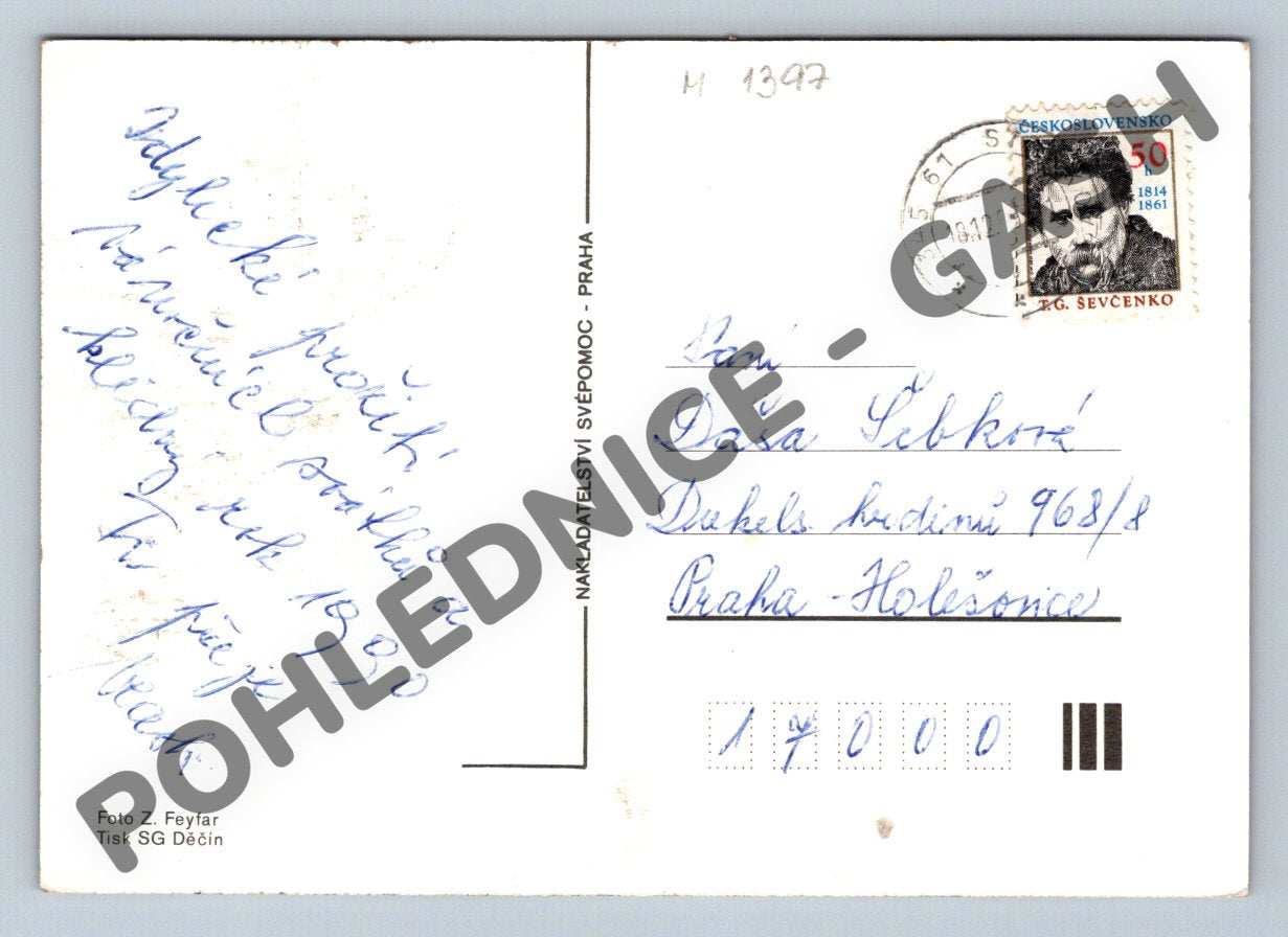 Originální pohlednice s fotografií zimní krajiny, pokryté silnou vrstvou ledu a sněhu. Jedná se o starší korespondenční pohlednici s rukopisným vzkazem a poštovní známkou z období Československa. Na zadní straně je otištěno datum odeslání, adresa a známka s vyobrazením T. G. Ševčenka. Fotografii pořídil Z. Feyfar, tisk provedl SG Děčín. Pohlednice je v dobrém sběratelském stavu, ideální pro milovníky zimních motivů a historické korespondence.