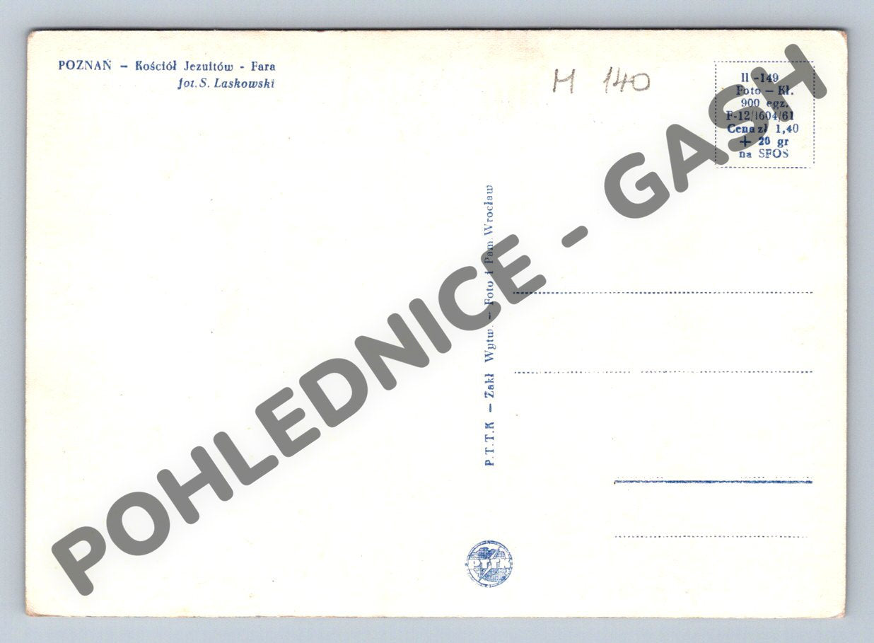 Nabízím originální pohlednici z Polska zobrazující interiér významného barokního chrámu — Jezuitského kostela (Fara) v Poznani. Fotografie S. Laskowski zachycuje detailně bohatě zdobený oltář a majestátní architekturu s nádhernými sloupy a freskami na stropě. Pohlednice je vydána v Polsku a představuje krásnou ukázku sakrální architektury, vhodnou pro sběratele pohlednic i milovníky historických staveb. Na zadní straně najdete tištěné informace o objektu a místo pro adresu a známku. Zachovalý stav, ideální do sbírky nebo jako dárek.