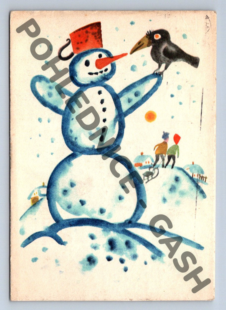 Originální stará pohlednice s ručně kolorovanou kresbou od J. Žemličky. Pohlednice nese vánoční a novoroční přání a byla odeslána v roce 1965 z Prahy. Na přední straně je veselý zimní motiv sněhuláka s vtipnými detaily (červený hrnec na hlavě, oranžová mrkev), doplněný ptáčkem. Zadní strana obsahuje ručně psaný text a zachovalé poštovní razítko i známku. Pohlednice výborně odráží atmosféru tehdejší doby i milou osobní komunikaci. Kolekce pro sběratele retro pohlednic i milovníky české ilustrace. Stav odpovídá stáří, známky běžného opotřebení. Rozměr odpovídá malému formátu před rokem 1950.