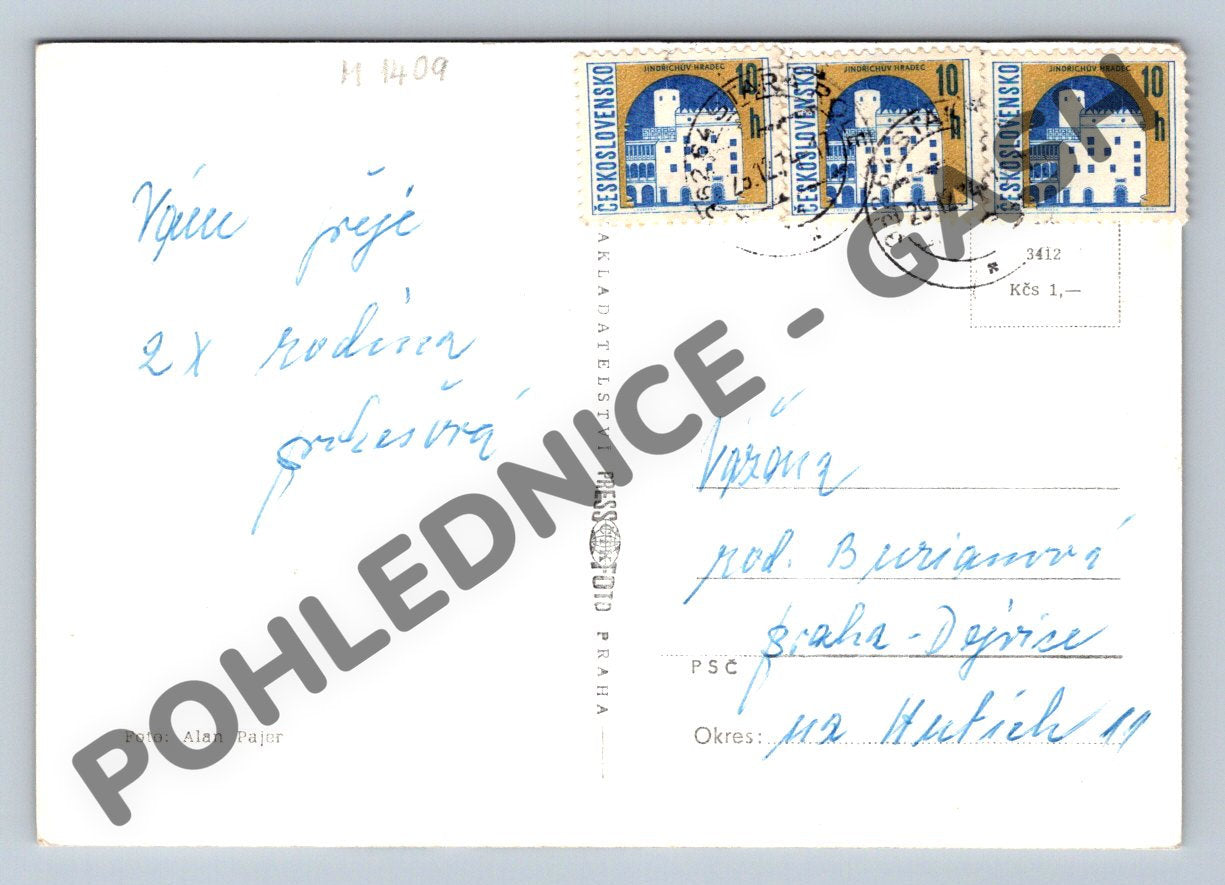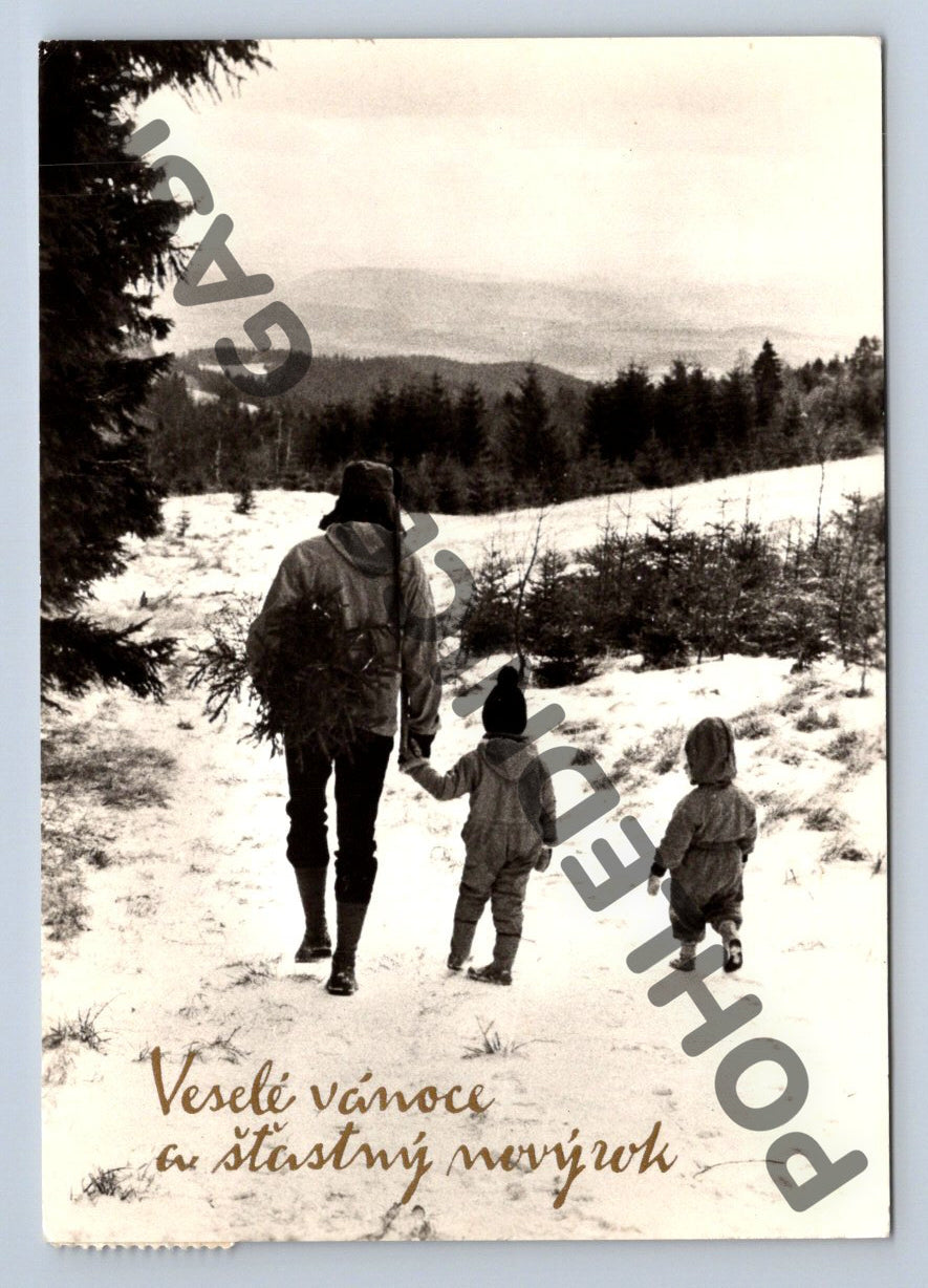 Originální černobílá vánoční pohlednice z Československa, se zimním motivem rodiny nesoucí vánoční stromek. Na přední straně je ručně psané přání Veselé Vánoce a šťastný nový rok . Na zadní straně jsou tři čs. známky Jindřichův Hradec v hodnotě 10 haléřů, poštovní razítko a ručně napsané věnování. Pohlednice je podepsaná a nese známky oběhu. Vydal Pressfoto Praha, foto Alan Pajer. Krásný dobový doplněk sbírky, vhodný pro milovníky českých vánočních pohlednic a historie.