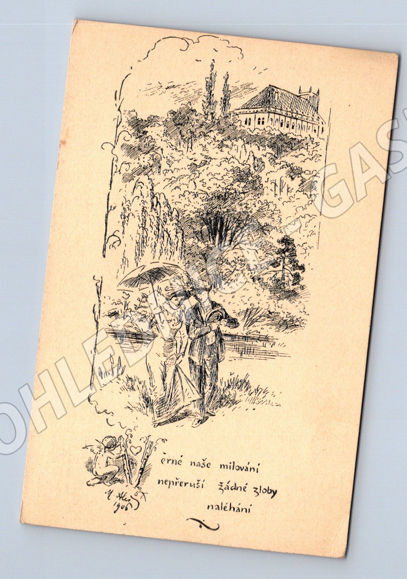 Starší pohlednice z období první republiky, zaslaná v roce 1933 z Brna do Poděbrad. Na přední straně umělecký černobílý nákres s poetickým veršem: Erně naše milování nepřeruší žádné žloby, náleháni. Zadní strana s poštovním razítkem Brno (8. IV. 33), poštovní známka 50 haléřů (Československo), ručně psaný pozdrav a adresa. Autorem kresby je Mikoláš Aleš. Pohlednice je zachovalá, s menšími stopami stáří, vhodná pro sběratele historických pohlednic z ČR nebo zájemce o umění a čs. poštovní historii.