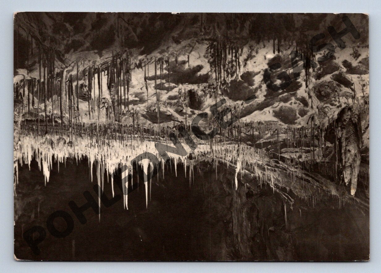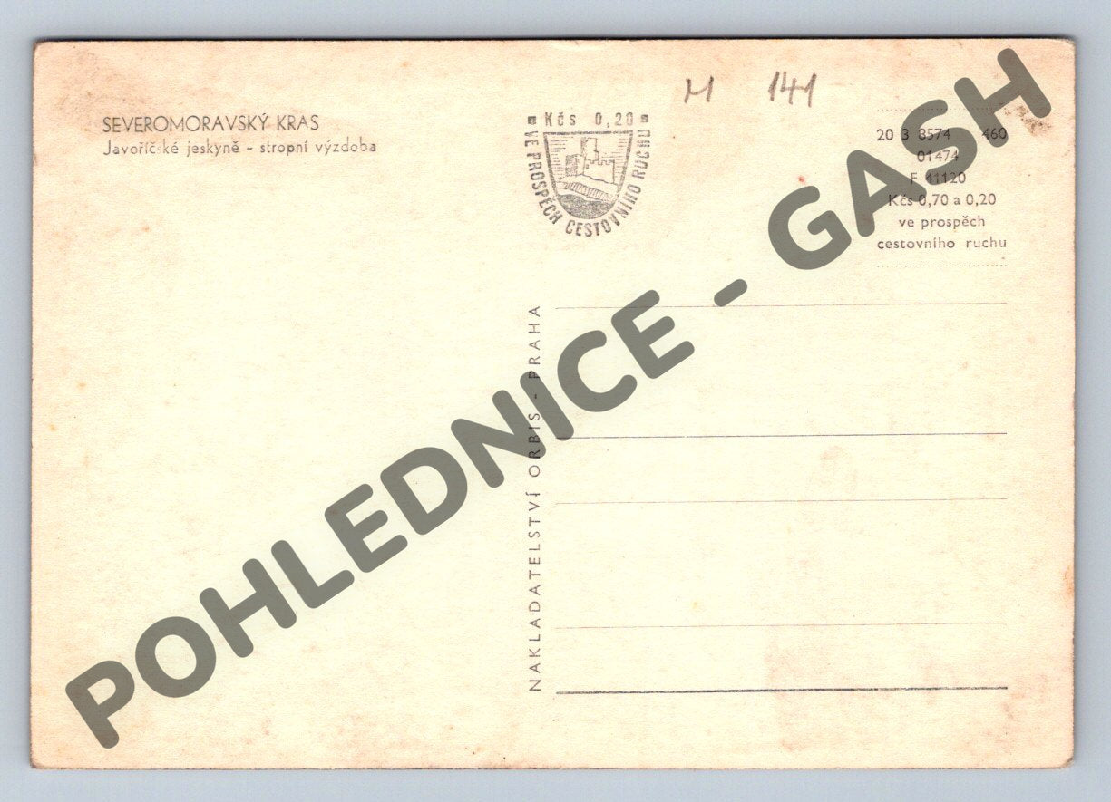 Originální černobílá pohlednice se záběrem na stropní výzdobu Javoříčských jeskyní na Severní Moravě (Severomoravský kras). Pohlednice vydána nakladatelstvím Orbis Praha, určená ke korespondenci, neprošlá poštou. Na zadní straně informační popis místa, natištěné čárování na adresu a místo pro známku. Pohlednice je v zachovalém stavu, drobné známky opotřebení po okrajích. Krásný sběratelský kousek, vhodný pro milovníky krasových útvarů a českých přírodních lokalit.