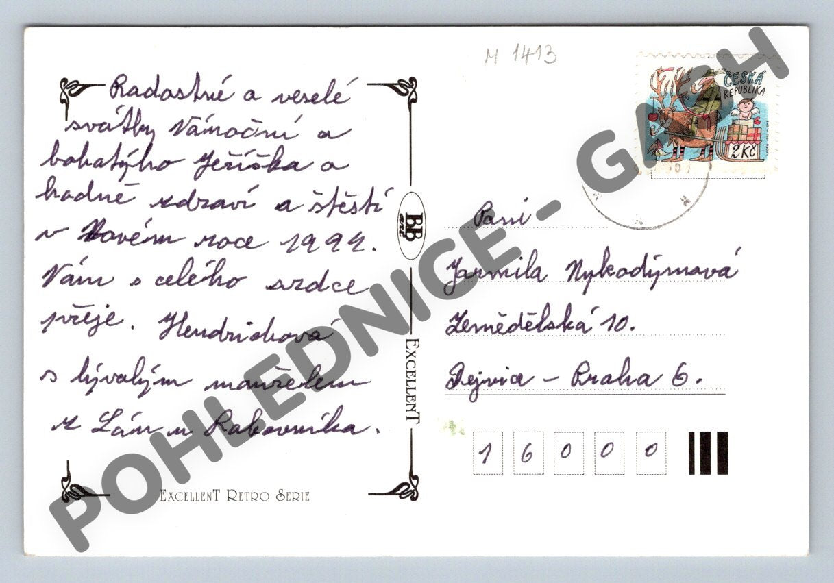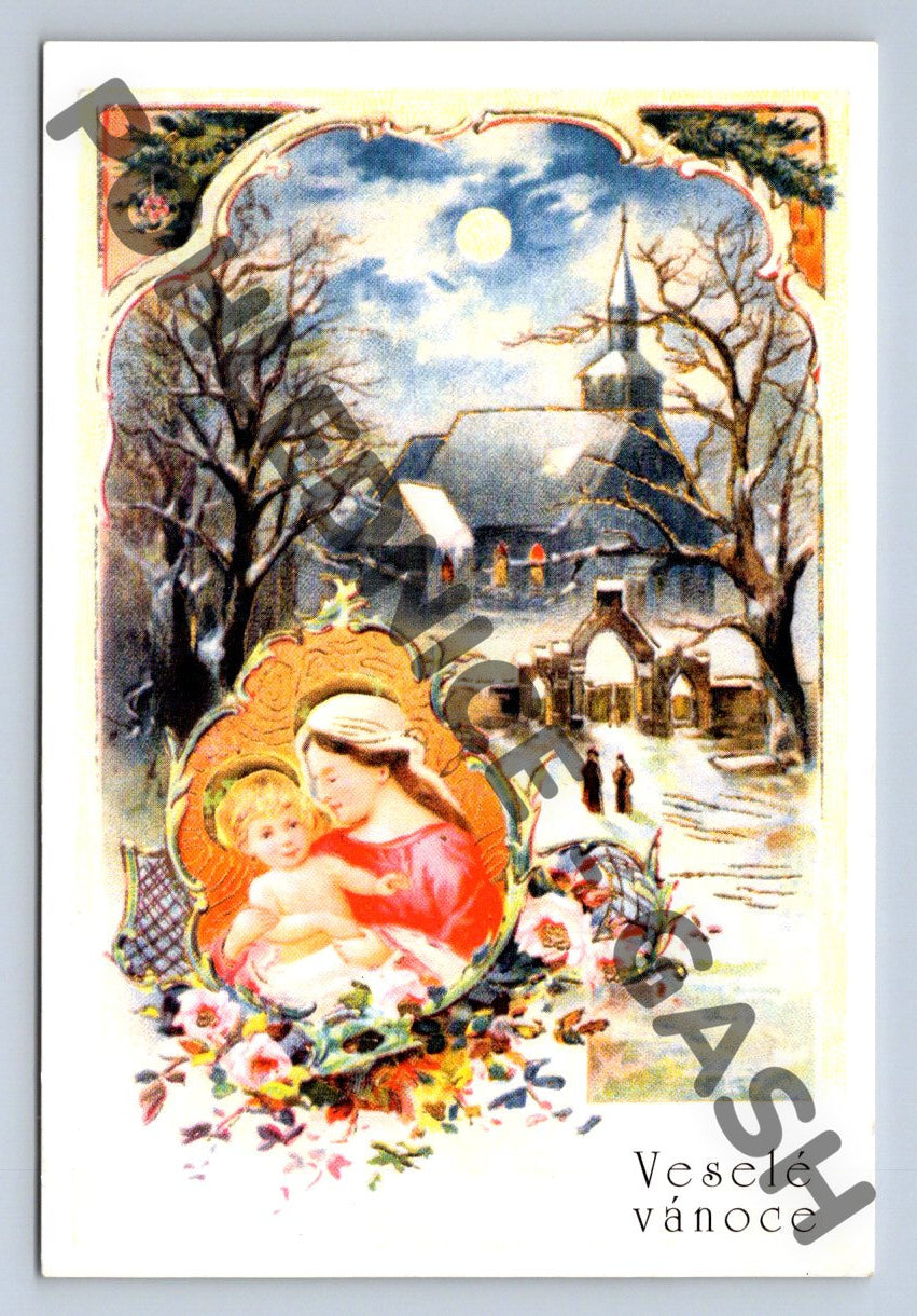 Nabízím originální retro pohlednici s vánoční tematikou z České republiky. Na lícové straně je krásně ilustrovaný vánoční motiv s kostelem v zasněžené krajině, zasazený do bohatého květinového rámečku, v popředí se zobrazením Madony s dítětem. Text na pohlednici přeje veselé Vánoce. Zadní strana je popsána ručně psaným vzkazem, opatřena českou známkou a razítkem. Pohlednice je ve velmi dobrém stavu a je vhodná jak pro sběratele, tak jako krásný dárek či dekorační předmět. Jedná se o EXCELLENT RETRO SERII, rozměr odpovídá velkému formátu vydávanému po roce 1950.