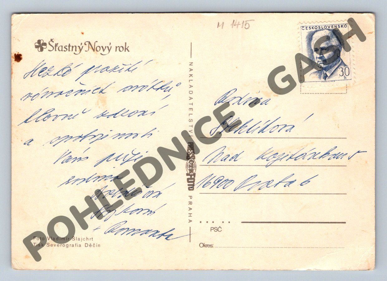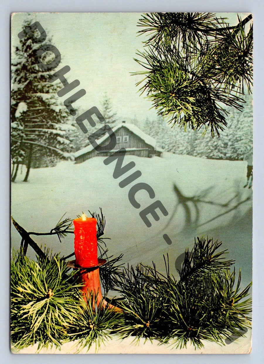 Originální stará pohlednice s novoročním motivem ze sbírky. Na přední straně je vyobrazen zimní motiv s větví jehličnanu a červenou svící, v pozadí lze spatřit chalupu zasypanou sněhem. Na zadní straně je ručně psané novoroční přání a známka Československo. Vydáno tiskárnou Severografia Děčín, foto Vladimír Šlajchrt. Pohlednice je v dobrém stavu, pouze běžné drobné opotřebení odpovídající stáří. Vhodné pro sběratele historických pohlednic nebo jako dekorace s atmosférou starých časů.