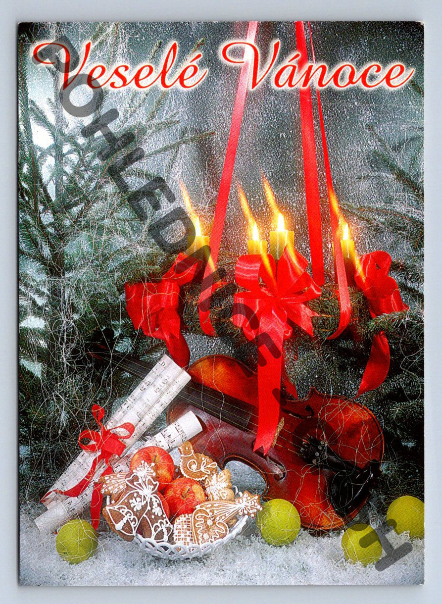 Vánoční pohlednice – Veselé Vánoce, housle, svíčky, perníčky, LEKO, ČR