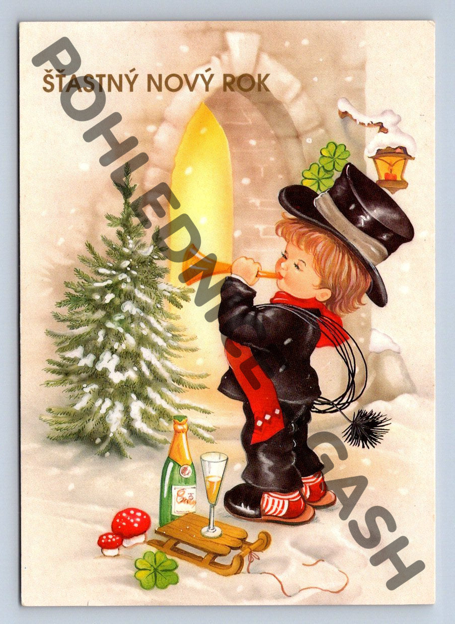 Vánočně-novoroční pohlednice s krásnou kresbou kominíka s trumpetu na saních a spoustou tradičních prvků štěstí (čtyřlístek, muchomůrky, šampaňské). Na přední straně je nápis ŠŤASTNÝ NOVÝ ROK . Pohlednice byla zaslána poštou, opatřena známkou a razítkem z Prahy z roku 1999. Na zadní straně je ručně psané věnování. Pohlednice je ve velmi dobrém stavu, vhodná pro sběratele a milovníky retro vánočních motivů.