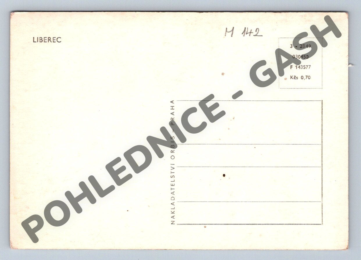 Starší černobílá pohlednice s panoramatickým pohledem na město Liberec. Dominantou pohledu je věž kostela, okolní historická zástavba a kopcovitá krajina v pozadí. Na zadní straně pohlednice je nápis 'Liberec', vydavatel Nakladatelství Orbis Praha a místo na známku i adresu. Pohlednice je ve velmi dobrém sběratelském stavu, bez popisu či známky. Vhodná pro sběratele pohlednic českých měst a regionální historie.