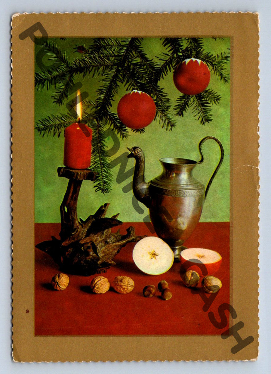 Originální stará vánoční pohlednice z období Československa s motivem tradičních vánočních ozdob – větvička jehličnanu, červené baňky, ořechy, jablka, svíčka a starodávná kovová konvice. Na zadní straně je ručně psané věnování s přáním Veselé vánoce a šťastný nový rok a originální známka s razítkem z roku 1973 (Martinitz). Pohlednice v pěkném sběratelském stavu, vhodná do sbírky i jako dárek pro milovníka starých pohlednic. Rozměr odpovídá malému formátu, vydavatelství Svépomoc Praha, foto J. Stoch.