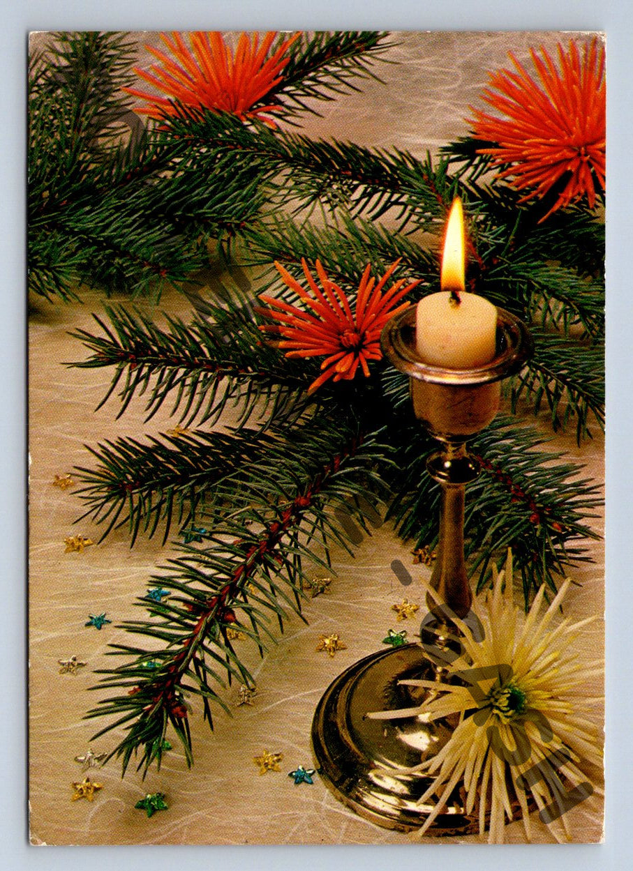 Originální vánoční pohlednice zaslaná v roce 1987 z Československa. Na přední straně je krásný dobový motiv vánoční dekorace s větvičkami jehličnanu, barevnými květy a ozdobnou svící v kovovém svícnu. Zadní strana nese známku s motivem Velké říjnové socialistické revoluce 1917–1987 a razítko s datem 17.12.1987. Rukou psané osobní věnování s přáním krásných Vánoc a šťastného nového roku. Pohlednice je ve velmi dobrém sběratelském stavu, vhodná pro sběratele historických pohlednic i jako krásný dobový dokument.