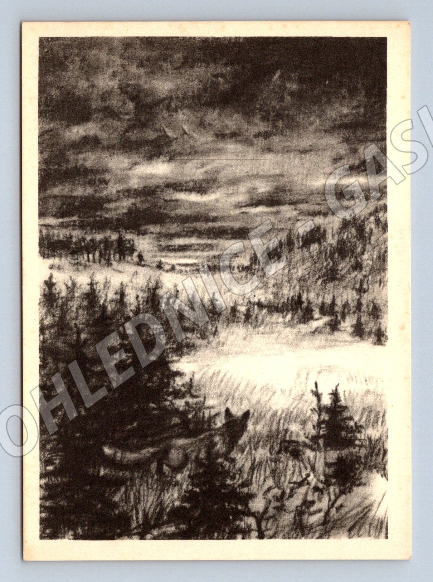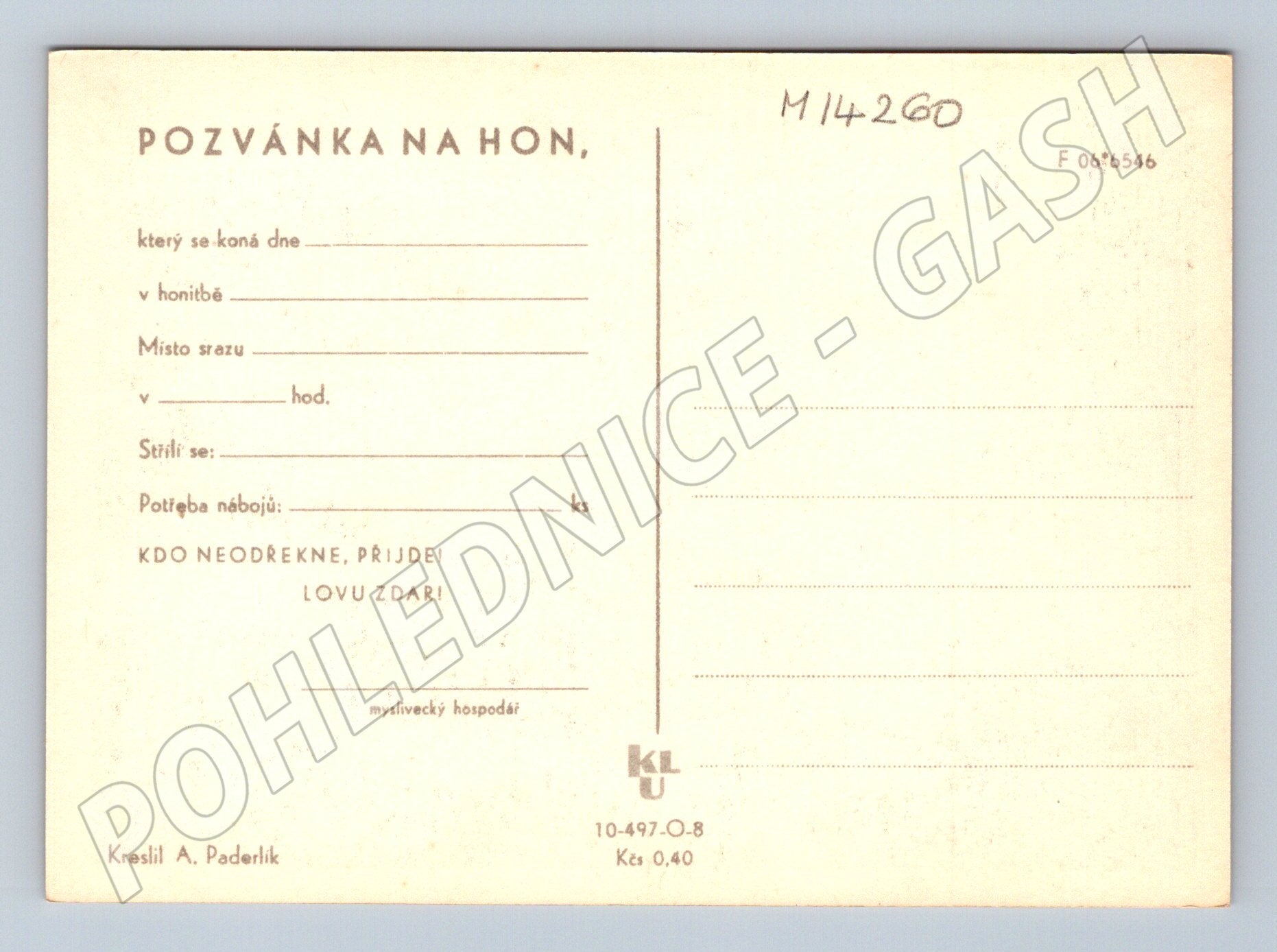 Originální pohlednice sloužící jako pozvánka na hon s jednostranným výtvarným motivem (kresba A. Paderlík). Na zadní straně jsou předtištěné kolonky pro vyplnění datumu, místa honu, druhu lovené zvěře a počtu nábojů. Pohlednice je ve velmi zachovalém stavu, bez odtržených rohů či výrazného poškození. Jedná se o zajímavý sběratelský kousek z oblasti myslivosti, vhodný pro milovníky historických pohlednic nebo myslivecké tematiky.