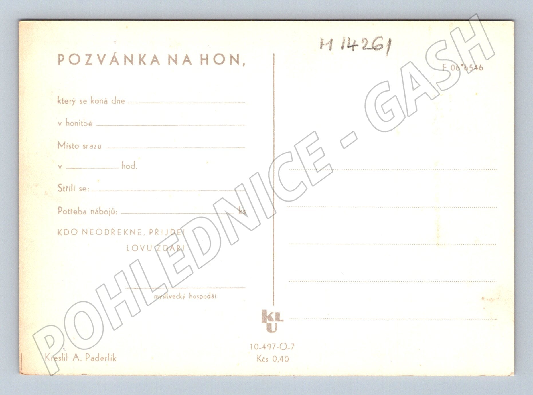 Originální česká pohlednice typu pozvánky na hon, pravděpodobně z první poloviny 20. století. Ilustrace od autora A. Paderlíka zobrazuje loveckou scenerii s lovci na louce a stromy v popředí, tónováno černobíle. Zadní strana slouží jako vyplnitelná pozvánka na myslivecký hon – místo pro datum, čas, druh zvěře a podpis mysliveckého hospodáře. Pohlednice je neprošlá, velmi dobrý zachovalý stav, lehké stopy stáří odpovídající věku. Vhodné pro sběratele mysliveckých či tematických pohlednic.
