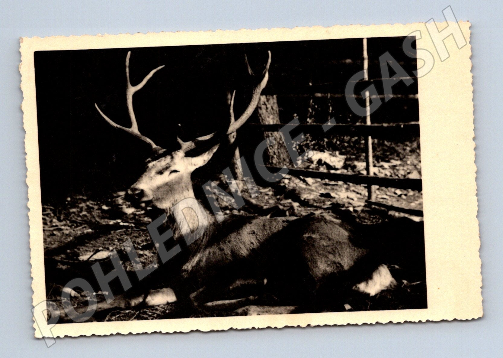 Originální černobílá pohlednice ze sbírky, zobrazující majestátního jelena ležícího ve výběhu. Pohlednice byla pořízena v roce 1956 v Jeseníku, jak je uvedeno na zadní straně. Má klasický dobový formát s ozdobně střiženými okraji, lehké stopy stáří na zadní straně, bez známky poštovního použití, ruční popis Jeseník, 1956 . Vhodné pro sběratele pohlednic se zvířecí tematikou či zájemce o staré fotografie české přírody.