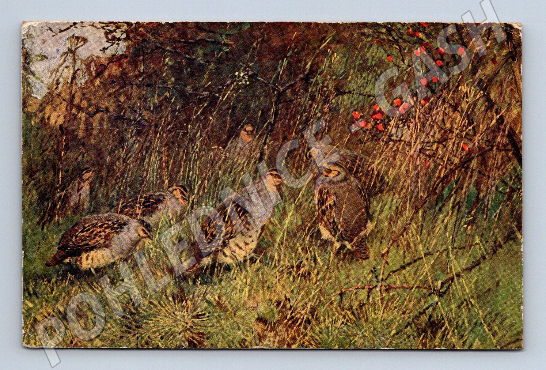Nabízím starou pohlednici s krásným motivem divokých koroptví v přírodním prostředí. Pohlednice je ilustrovaná s jemným smyslem pro detail a barevnost, což jí dodává půvabný, malířský vzhled. Zadní strana je popsána ručně psaným textem, opatřena razítkem z Prahy (datováno 18. IX. 35) a adresována slečně Kateřině Kryšlové. V levé dolní části je označení vydavatele: Nakladatel časopisu LOVECKÝ OBZOR, red. J. V. Rosmarin, Praha-Karlín, Vinobudy . Pohlednice je vhodná pro sběratele loveckých, přírodních a zvířecích motivů či jako historický artefakt.