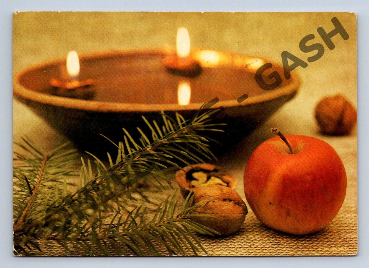 Vánoční pohlednice s motivem svíček, ořechů a jablka – Československo, rarita do 1950