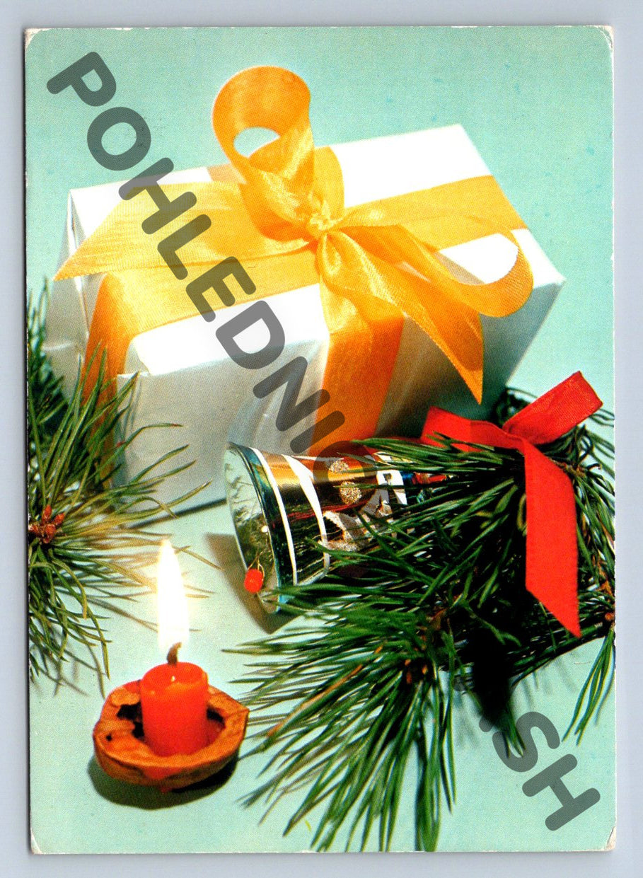 Vánoční pohlednice s motivem dárku s velkou žlutou stuhou, větví jehličnanu, vánoční ozdobou ve tvaru zvonku a zapálenou svíčkou ve skořápce. Na zadní straně je tisk Veselé vánoce a osobní rukopisné přání, razítko z Prahy z roku 1986 a známka ČSSR v hodnotě 50 haléřů. Odeslána na adresu v Praze 6. Výtvarné podání fotografie Pavel Čanda, tisk Severografia Děčín. Pohlednice v dobrém sběratelském stavu s drobným opotřebením.