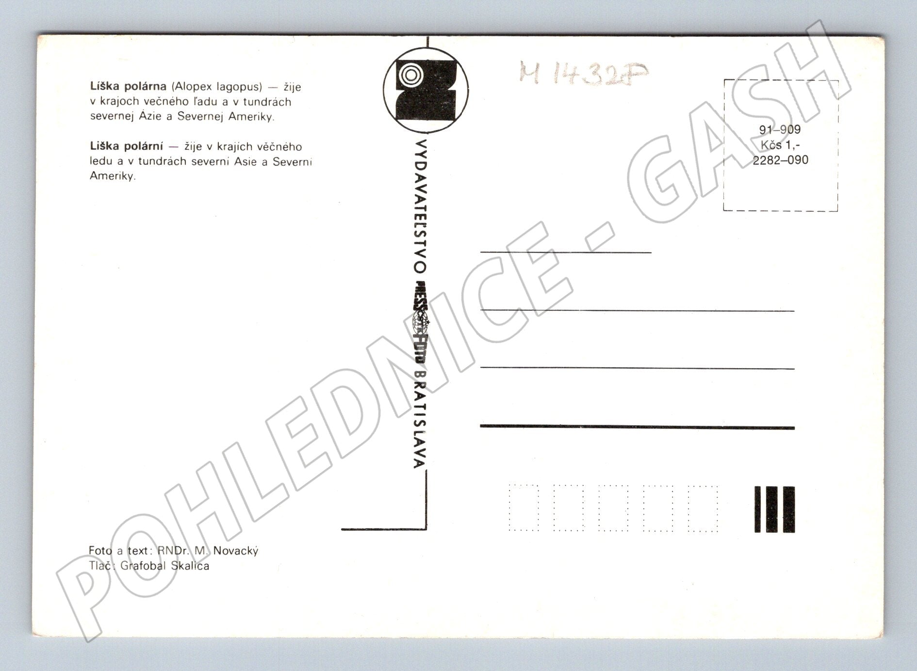 Nabízím originální pohlednici s motivem lišky polární (Alopex lagopus), kterou vyfotil RNDr. M. Novacký. Pohlednice byla vydána vydavatelstvím Obzor Bratislava a vytištěna v tiskárně Grafobal Skalica. Na přední straně je detailní fotografie ležící lišky polární v přírodním dřevěném výběhu, která je známá svým bílým zimním kožichem. Na zadní straně se nachází krátký popis v češtině i slovenštině o životě lišky polární a místo pro známku a adresu. Pohlednice je neprošlá a ve velmi pěkném stavu, vhodná pro sběratele i milovníky zvířat.