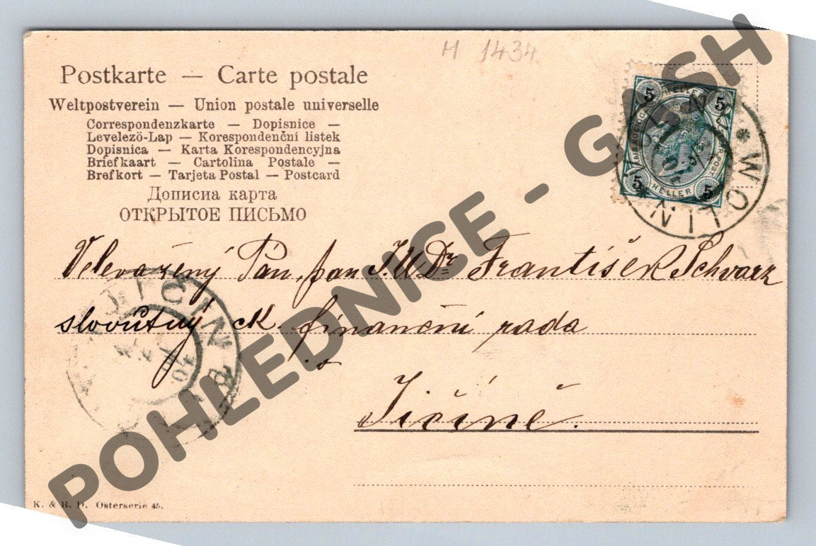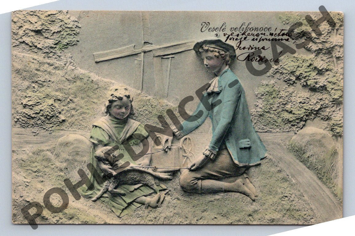 Historická pohlednice s velikonoční tematikou, malý formát, odeslaná a opatřená známkou z Rakousko-Uherska. Na přední straně je umělecký reliéf dětí s beránkem na malebném velikonočním motivu a věnováním ve staročeštině. Zadní strana obsahuje dobovou korespondenci a razítko z počátku 20. století. Pohlednice je ve velmi dobrém sběratelském stavu, bez výraznějších vad, vhodná jak pro sběratele velikonočních pohlednic, tak i pro zájemce o staré pohlednice z Čech před rokem 1950.