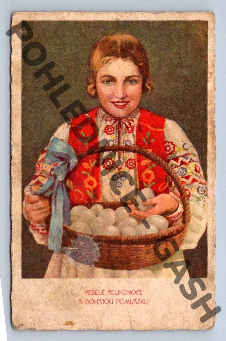 Velikonoční pohlednice – dívka v kroji s košíkem vajec, 1932, Bráničký