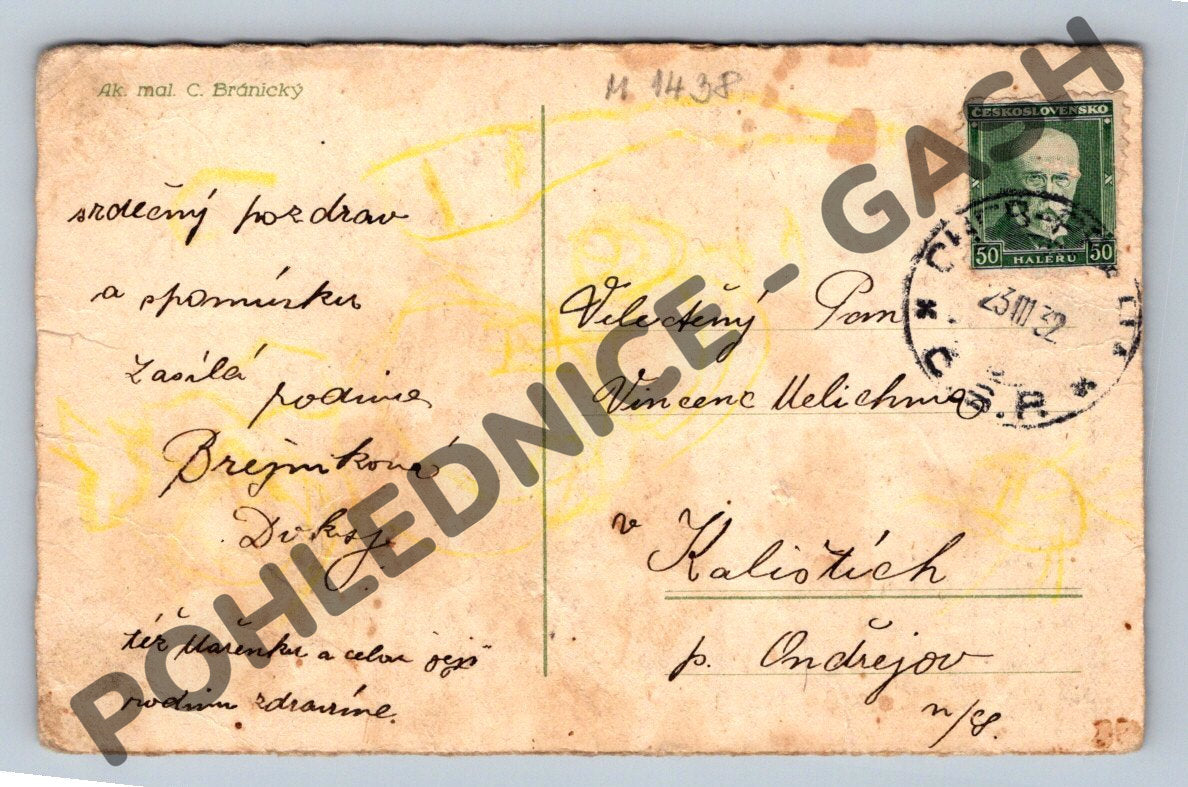 Starobylá velikonoční pohlednice z období první republiky. Na přední straně je malovaný portrét dívky v tradičním kroji držící košík s vejci, s přáním Veselé Velikonoce a bohatou pomlázku. Autorem je akad. malíř C. Bráničký. Zadní strana pohlednice obsahuje ručně psaný vzkaz a známku Československo 50 haléřů, s poštovním razítkem z roku 1932. Pohlednice nese stopy stáří (otřepy a zašpinění), což dodává autentickou patinu a sběratelskou hodnotu. Výjimečný etnografický motiv vhodný do sbírky tradičních zvyků a řemesel.