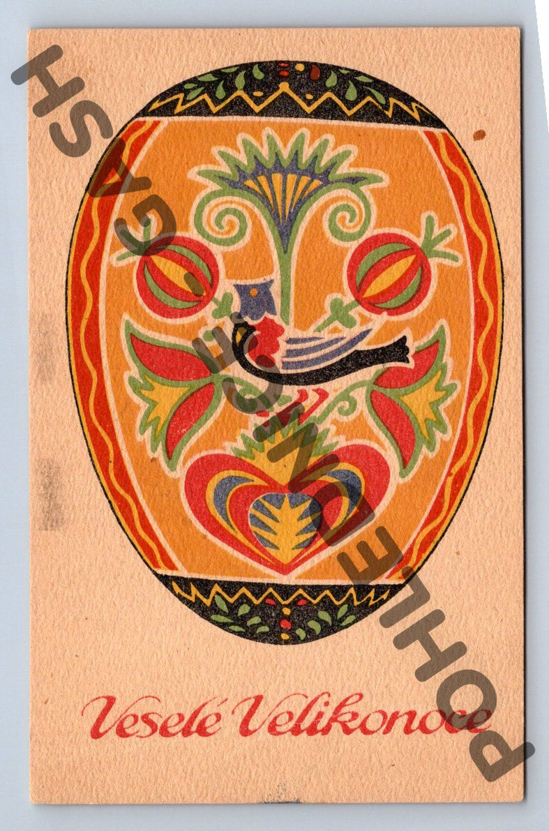 Velikonoční pohlednice s etnografickým motivem. Na přední straně je barevná kresba inspirovaná tradiční malbou kraslic s folklórním designem a ptáčkem, doplněná přáním Veselé Velikonoce . Pohlednice je ve velmi dobrém stavu, bez známek použití. Zadní strana je nevyplněná, s předtištěnými linkami na adresu a vydavatelskou značkou. Ideální sběratelský kousek pro milovníky českého folklóru a velikonočních tradic.