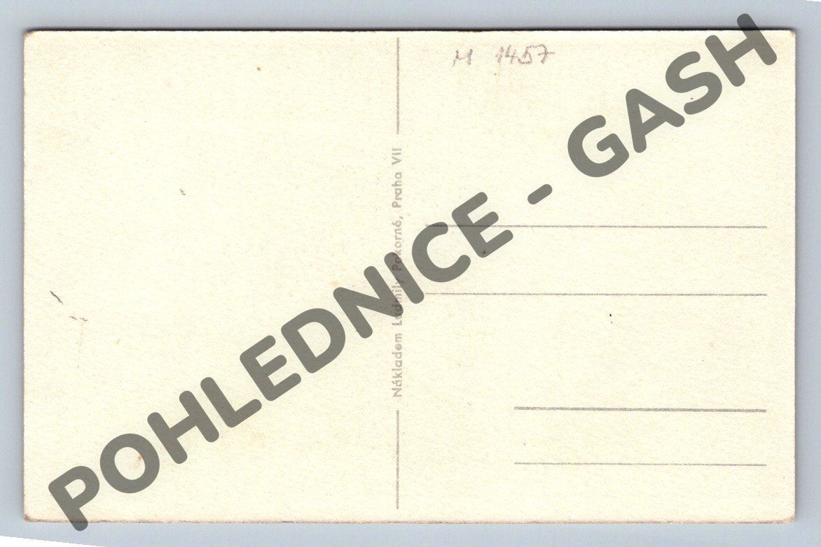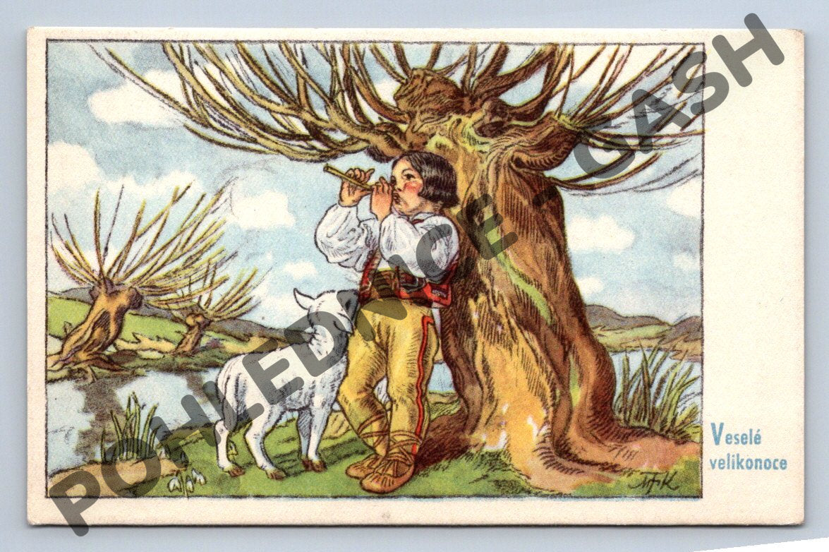 Velikonoční pohlednice s etnografickým motivem, na které je zobrazen mladý pastevec v kroji s ovčím beránkem pod vrbou. Pastýř hraje na flétnu a typické prvky venkovské krajiny vytvářejí malebnou atmosféru českého venkova. Na přední straně nápis Veselé velikonoce. Typický barevný tisk, pravděpodobně ze začátku až poloviny 20. století. Zadní strana je nepopsaná, vydavatel: Nákladem Ludmily Pokorné, Praha VII. Výborný sběratelský stav.