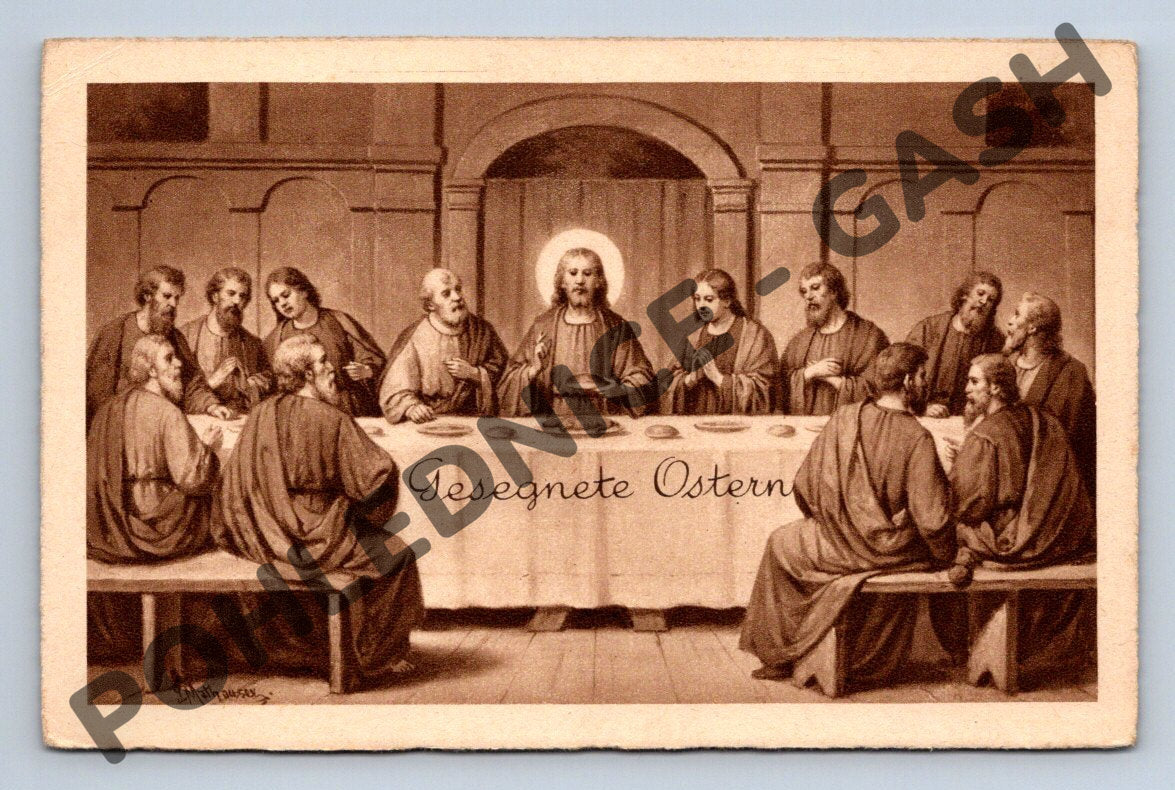 Historická velikonoční pohlednice s motivem Poslední večeře Páně. Na přední straně pohlednice naleznete umělecké ztvárnění slavné biblické scény, kde Ježíš Kristus sedí u stolu se svými apoštoly. Nápis Gesegnete Ostern znamená Požehnané Velikonoce v němčině. Zadní strana je nepopsaná, s vyznačeným místem na známku a adresu. Pohlednice je ve sběratelsky velmi pěkném stavu, vhodná jako dárek nebo doplněk sbírky historických pohlednic s náboženskou tematikou.